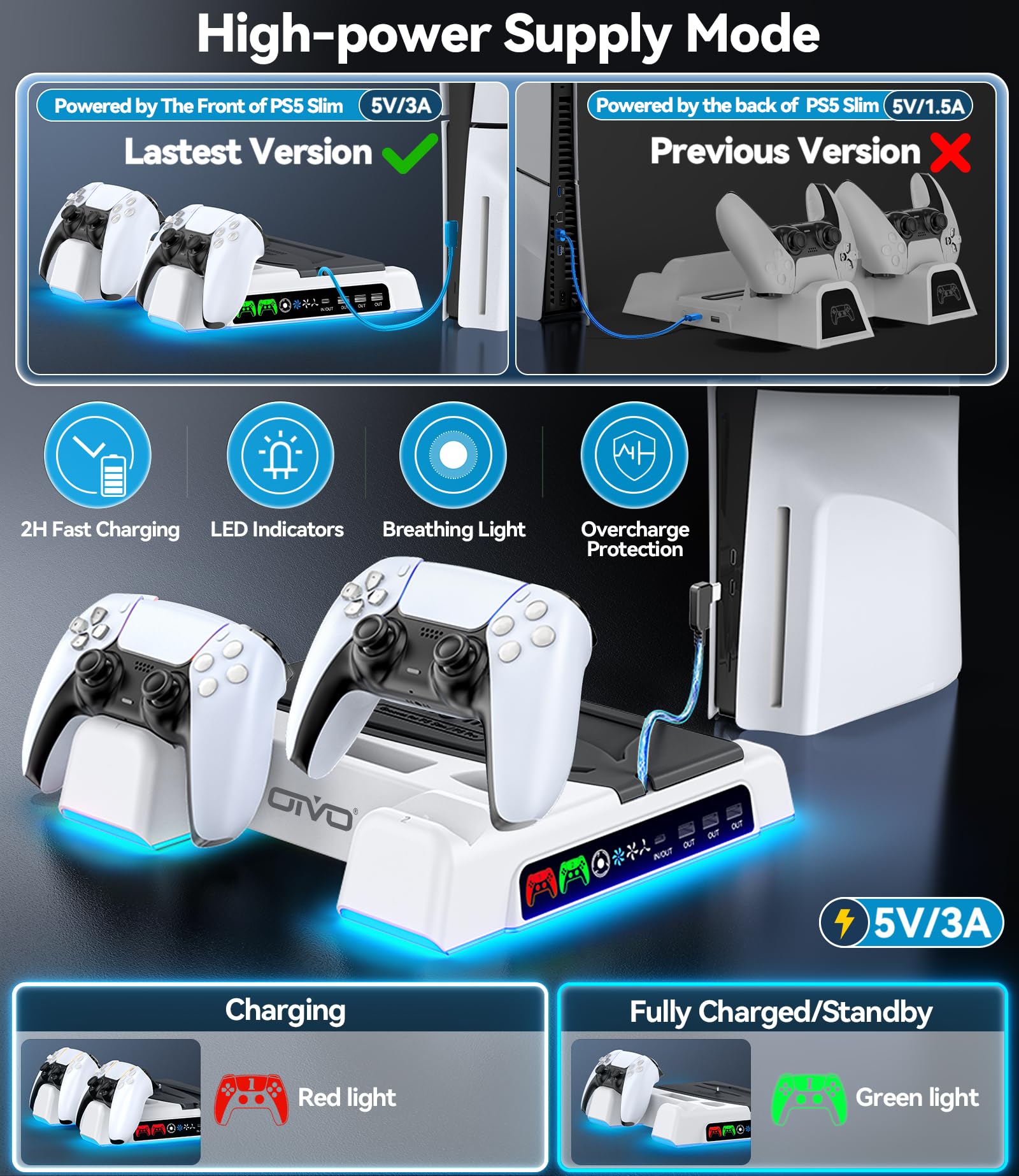Dual High-Speed PS5 Controller Charger Station and LED Indicators: Use Playstation 5 charging station to refuel dual PS5 dualsense controllers with charging cable in less than 2 hours simultaneously.