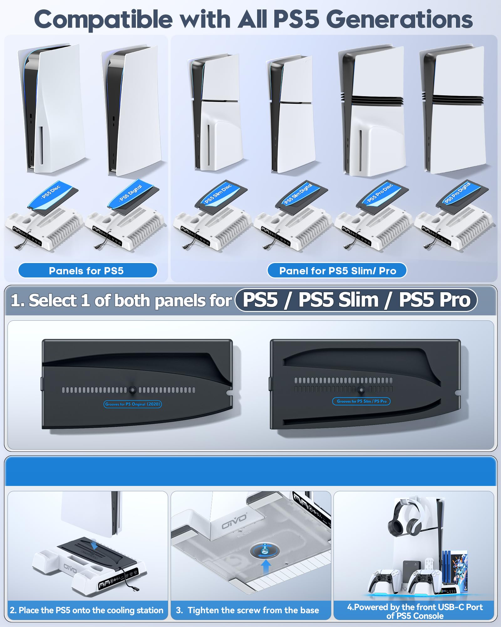 Multifunctional for 2020/2023 Slim/2024 Pro Playstation 5 Digital Edition and Disc Edition Consoles: This stand is suitable for all ps5, ps5 console disc version and 2023 PS5 slim console (CFI-2000A01, CFI-2000B01) ,PS5 Pro console (CFI-7019B01X).