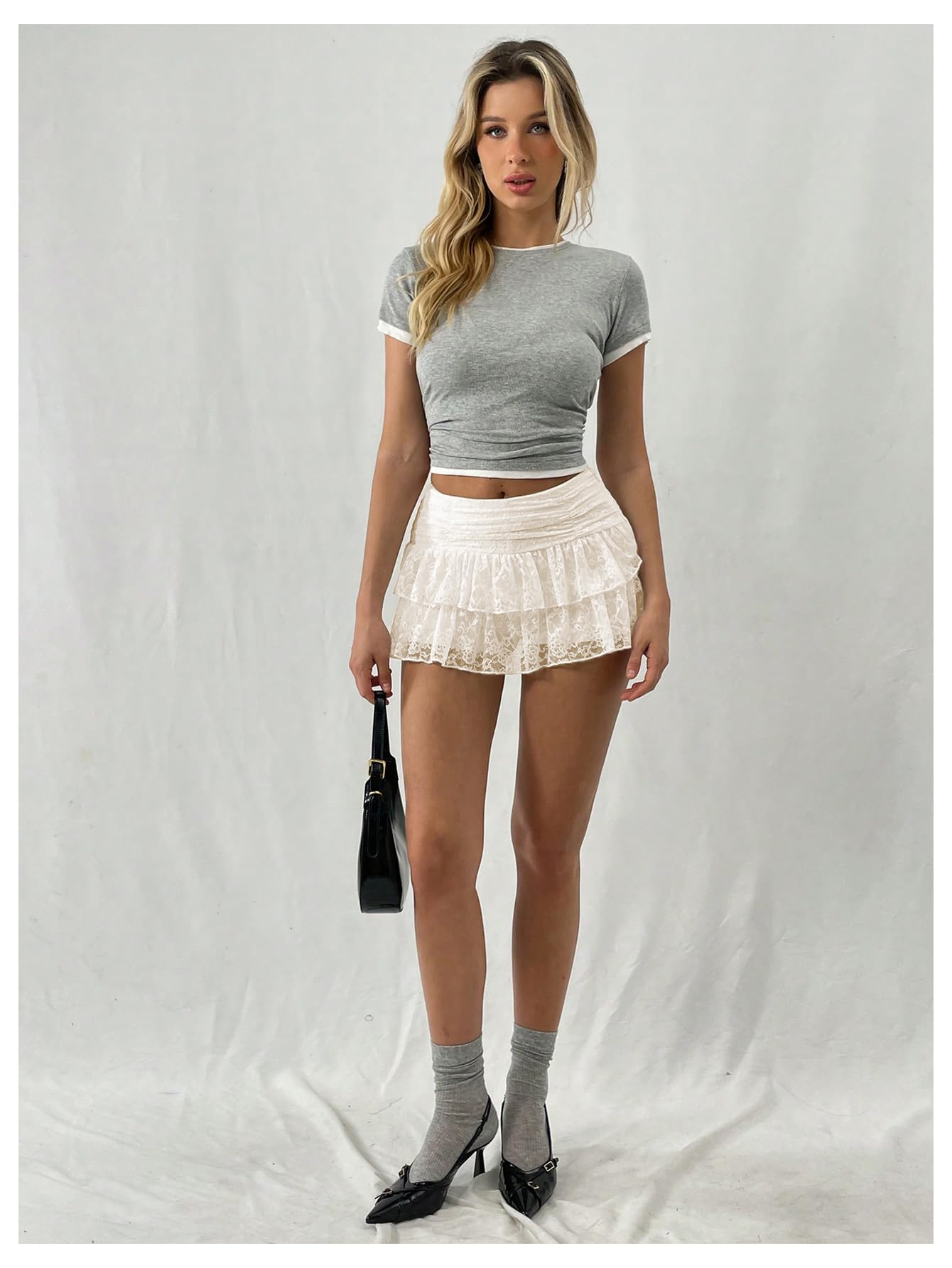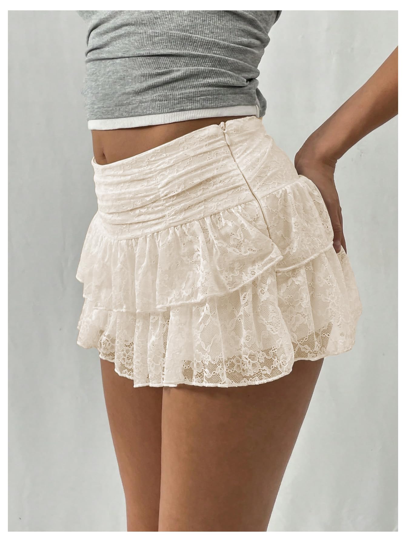 This adorable mini skirt features delicate lace layers, a flattering ruched design, and a feminine A-line silhouette, making it a stylish and versatile addition to your wardrobe