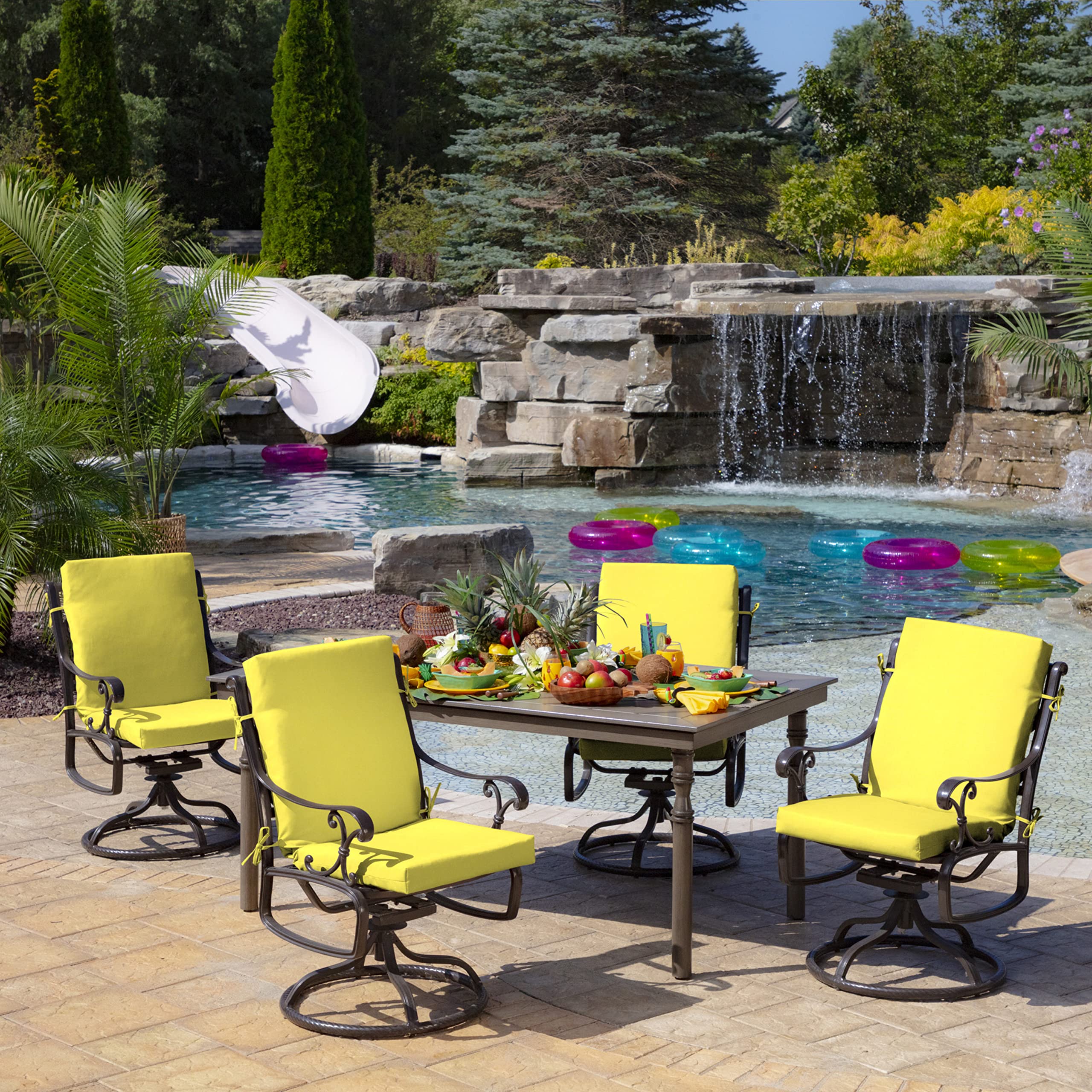 Designed to fit standard outdoor dining chairs, this highback cushion measures 20 in W x 44 in H x 3.5 in T, including a 20 x 20 seat cushion and 20 x 24 chair back for complete seating support