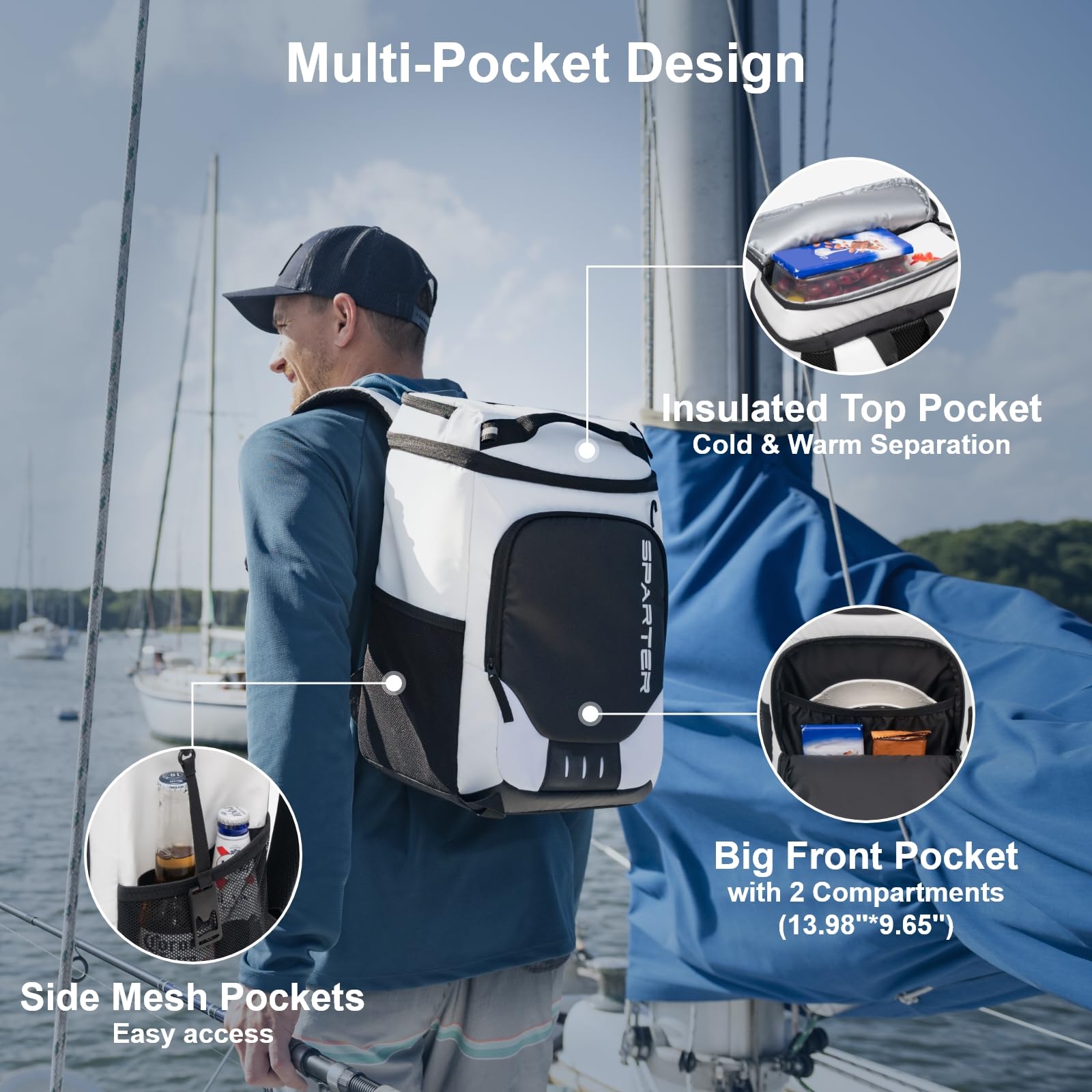 20 Hours Retention: Sparter backpack cooler is insulated with thickened 8 mm foam, together with advanced silver PEVA seal to keep beverages cool up to 20 Hours throughout the day for beach picnic, hiking, camping, trip, boating, baseball / golf and work.
