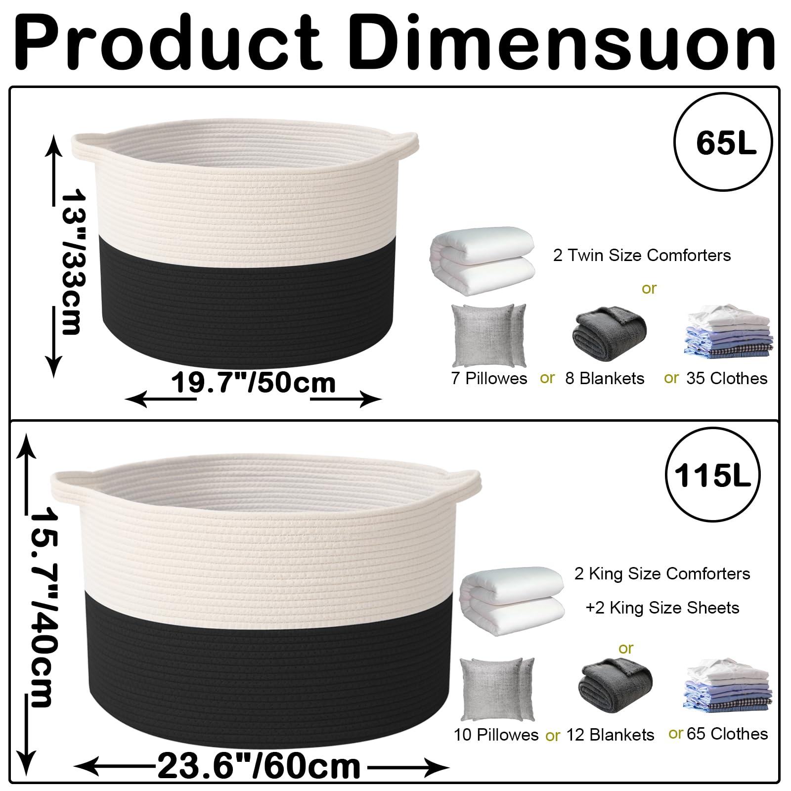 【115L Extra Large Capacity】This 23.6"L x 23.6"W x 15.7"H basket is perfect for storing throw blankets, pillow, cushions, clothes, towels,toys and stuffed animals.It can also add a nice style to your living room, bedroom, laundry room, nursery or any room