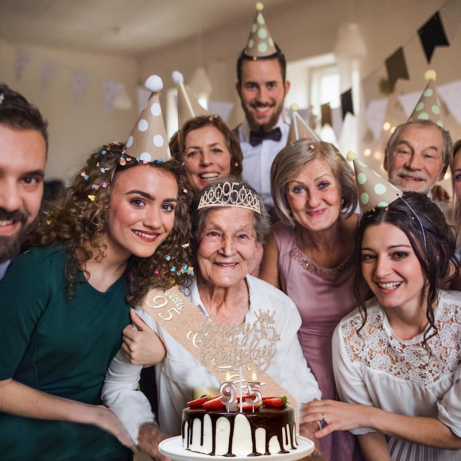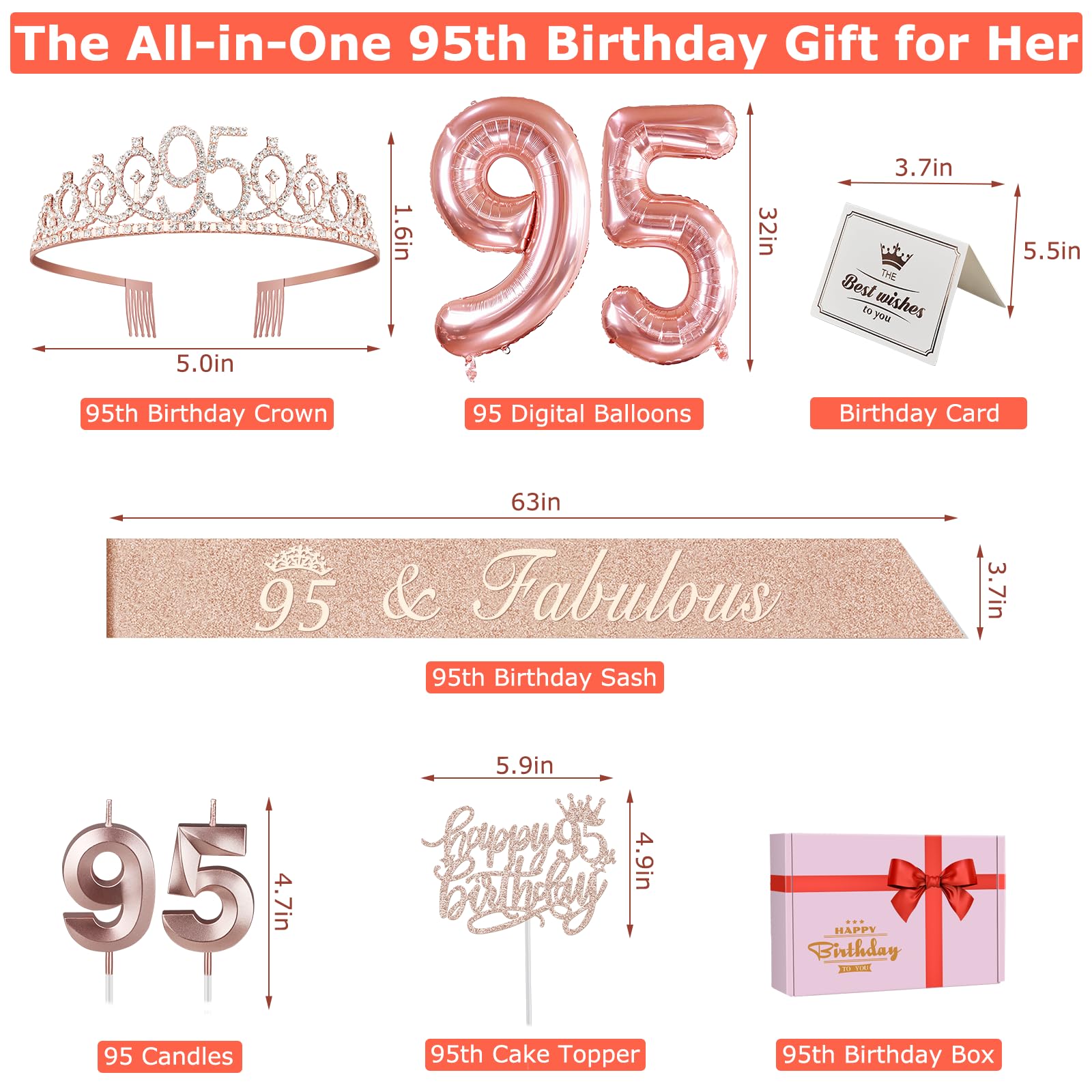 γ95 Birthday Decorations Setγ: Package Coming with Glittery Rhinestone 95th Birthday Tiara/Crown x 1pc, Rose Gold 95th Birthday Sash x 1pc, Happy 95th Birthday Cake Topper x 1pc, Number 95 Birthday Candles x 1set, Big Rose Gold Numeral 95 Balloons x 1 set, Birthday Card x 1pc. This great valuable 95th birthday gift for women has been packed in a beautiful gift box for ready presentation