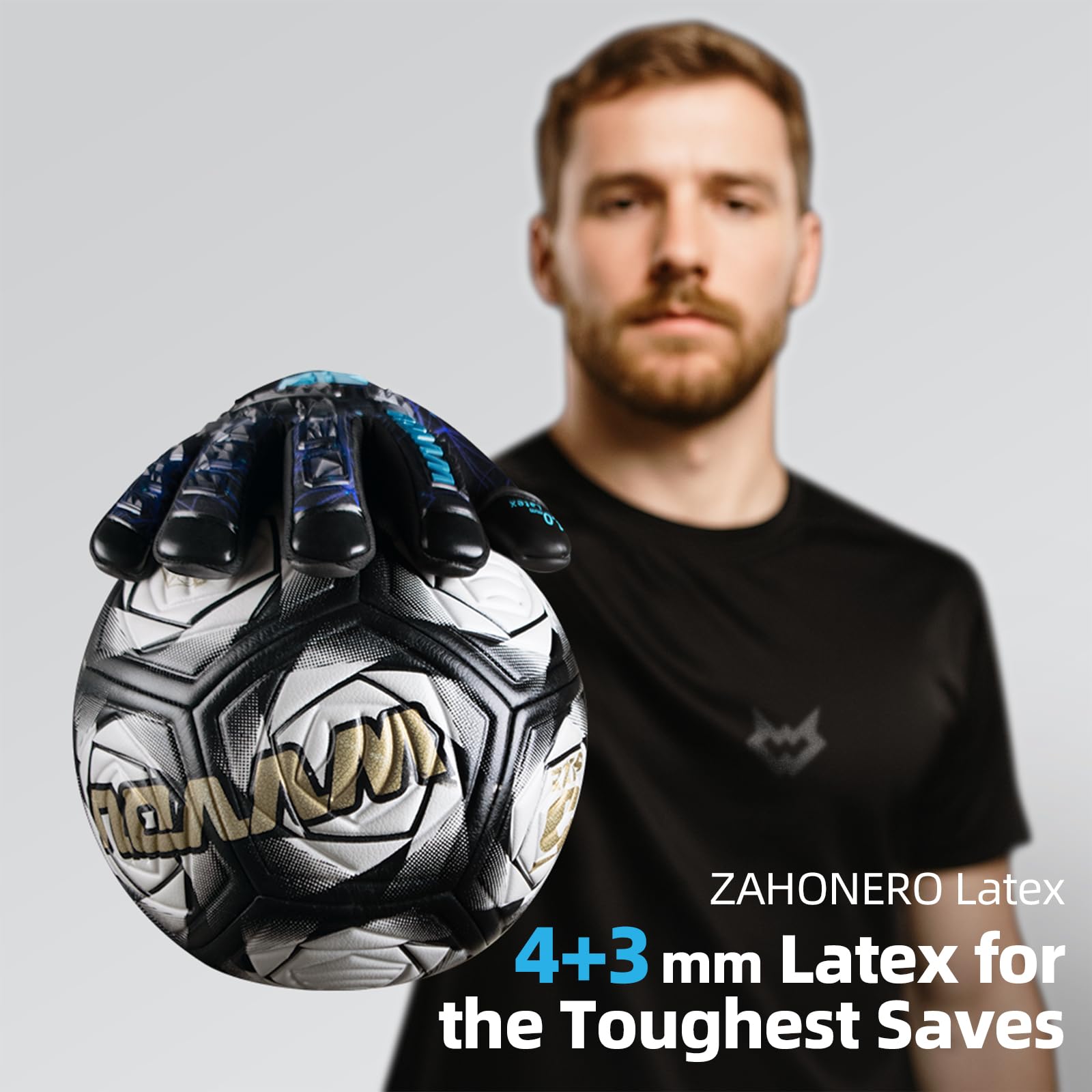4+3MM STICKY LATEX: The goalie gloves are made of 4+3mm sticky latex, which is full of stickiness and strong wear resistance, creating incredible grip strength and ball control in any weather.