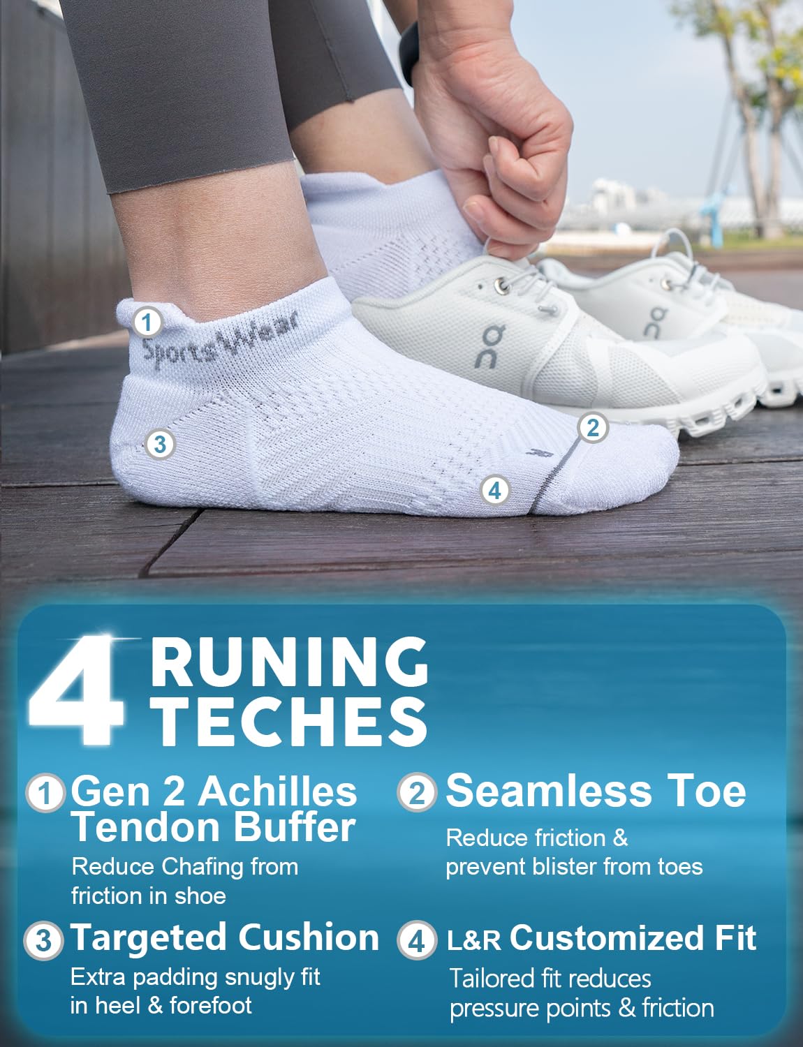【Innovative Anti-Blister Design】: Engineered with reinforced padding at the heel and forefoot to protect against shoe friction. Includes seamless toe closure, targeted cushioning, ankle protector, and Achilles tendon buffer to prevent blisters and ensure a smooth, irritation-free run.