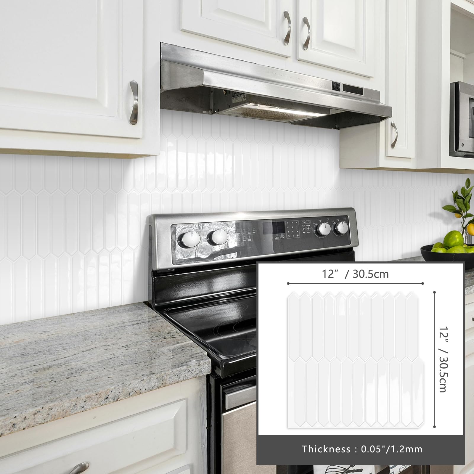 Package Includes:10 sheets of White long hexagon vinyl backsplash tiles, with each sheet measures 12""x12"". These tiles boast a modern design, ensuring a stylish upgrade for your space