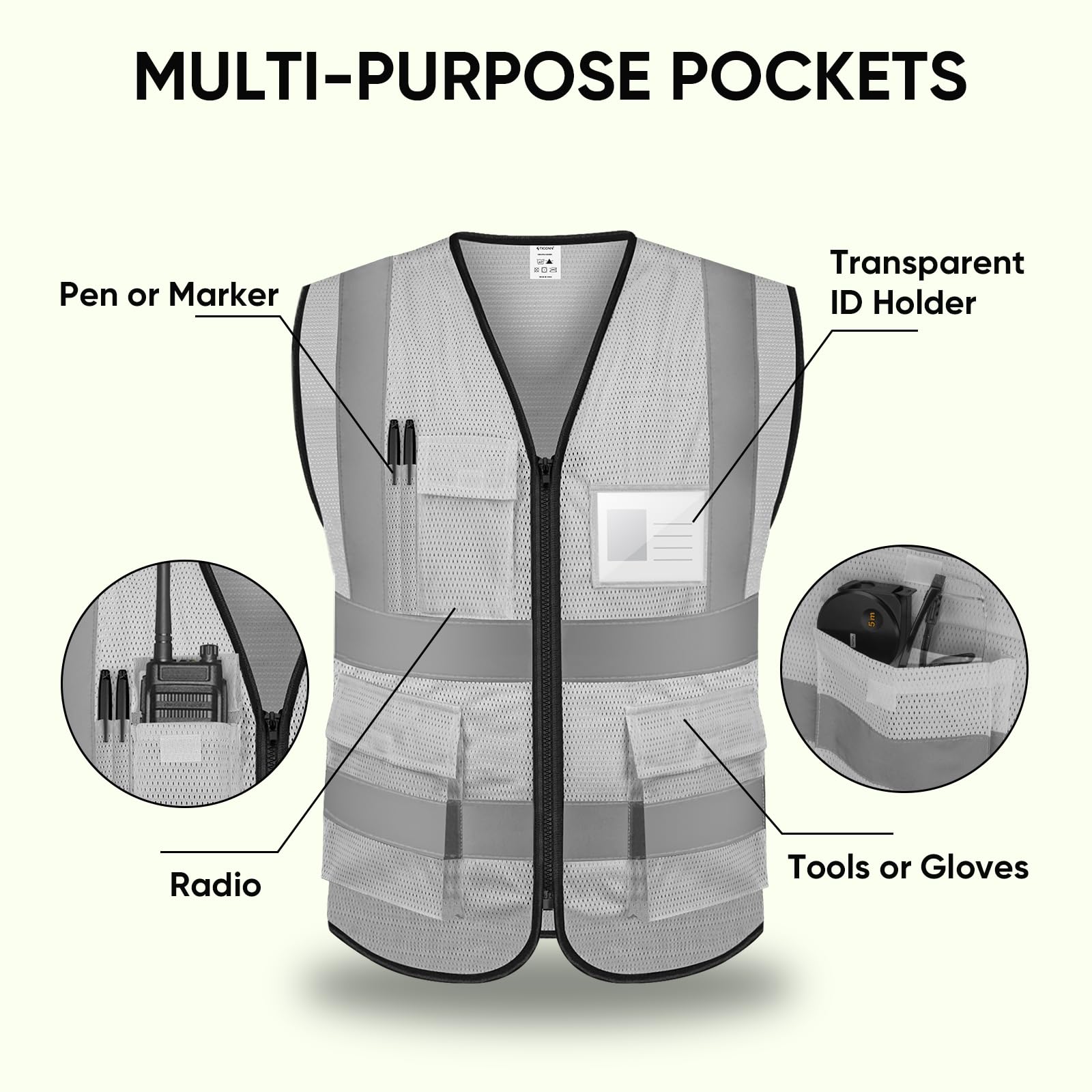 [MULTI-PURPOSE POCKETS] This high visibility vest has functional pockets built-in including a Transparent ID pocket, pen holder, radio pocket, and the 2 large pockets that can hold your tools and gloves.