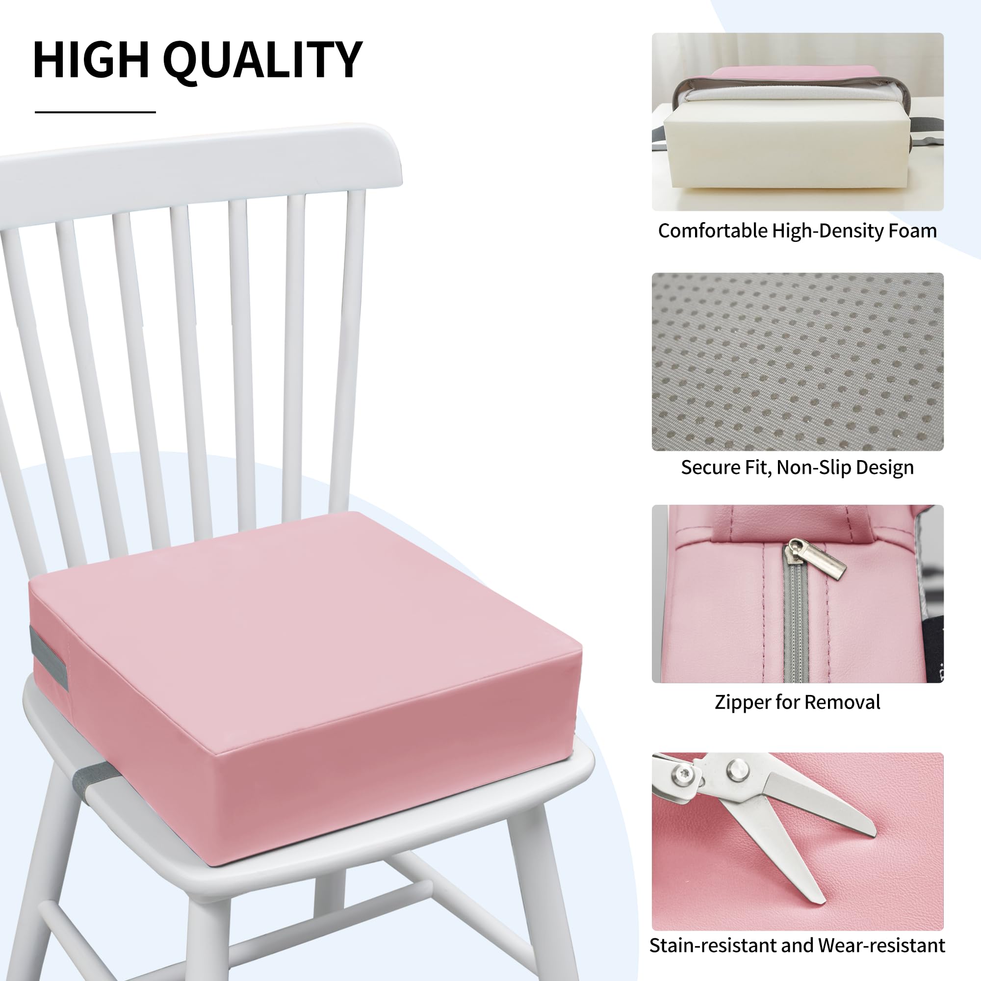 Easy to clean: The booster seat cover is made of PU leather. It is waterproof and easy to clean. If food accidentally falls on the booster seat, just wipe it with a rag. The dining chair cover booster cushion is also machine washable and removable. But the vast majority of the time there is no need to clean, just wipe gently with a damp cloth to restore cleanness