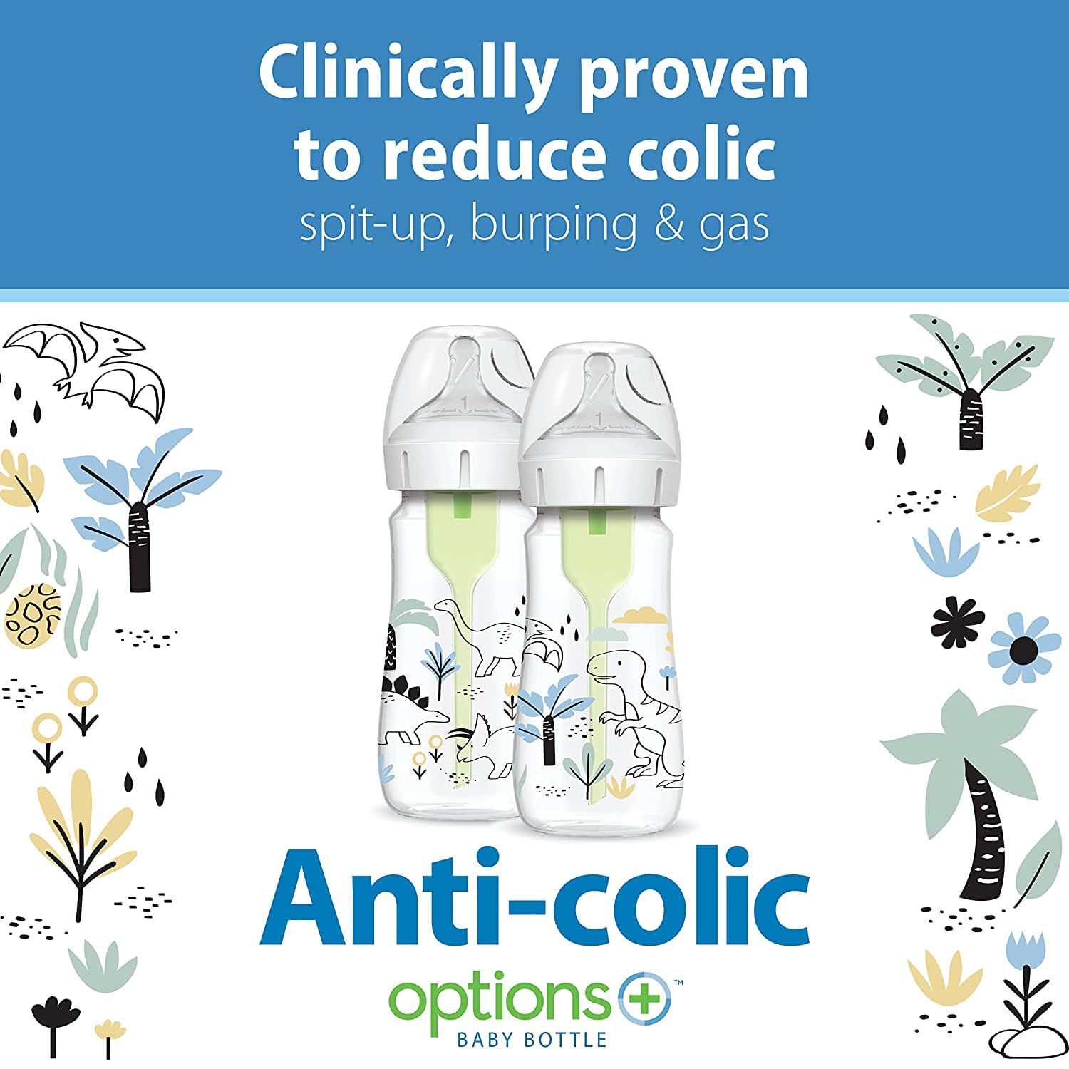 Contains (2) Dr. Brown's Natural Flow Anti-Colic Options+ Wide-Neck Baby Bottle Designer Edition Bottles, Dino Decos, 9oz/270mL, Level 1 Nipple, 0m+ and (1) Dr. Brown's Baby Lovey Pacifier Holder & Teether Clip, Soft Plush Stuffed Animal Triceratops Pacifier Tether with HappyPaci, 100% Silicone, 0-12m