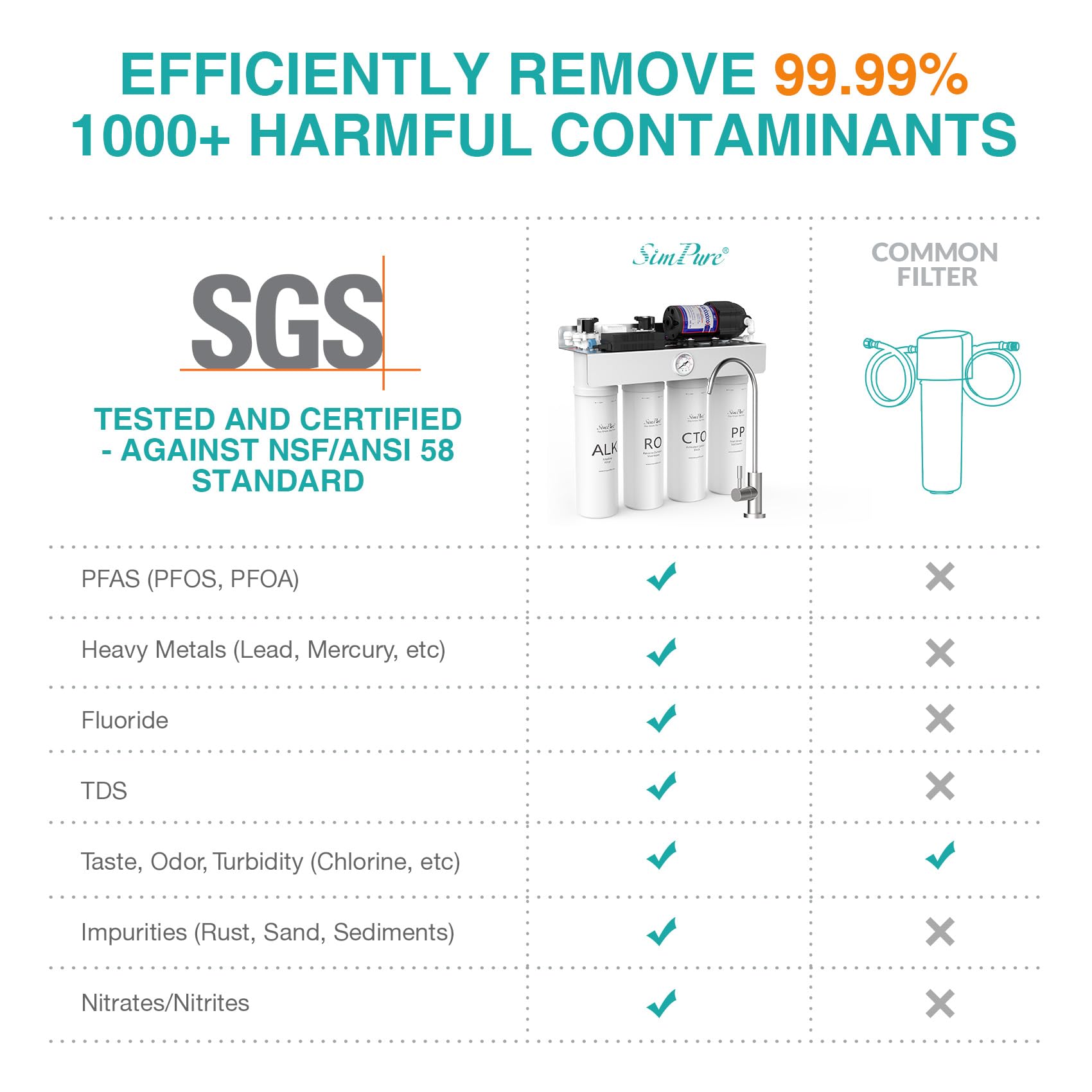 SGS CERTIFIED and TESTED: Against the NSF/ANSI 58 Standard. The SimPure ROULP-3012-400-T1 has been verified and tested by SGS, this ensures its exceptional quality and performance. It effectively removes over 99.99% of 1000+ contaminants, including TDS (fluoride, nitrates/nitrites), PFAS/PFOA/PFOS, heavy metals (lead and arsenic), chloride, etc. Enjoy purified drinking water with confidence and say goodbye to the hidden dangers of tap water