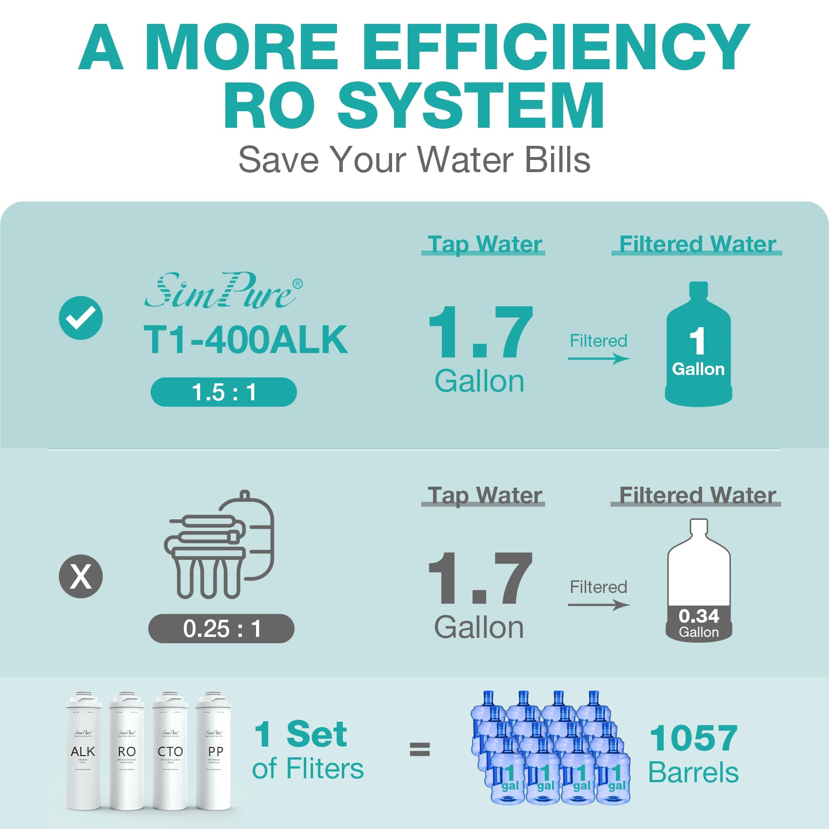 EFFORTLESS HYDRATION & COST-EFFECTIVE: The SimPure T1-400 Series water purifier comes with a complete set of quick-change twist filter cartridges that deliver 1057 gallons of purified water (equivalent to around 8000 bottled water). Embrace a sustainable way of living, cut down on plastic waste, and save cash. It's more than just purified water - it's an enhanced lifestyle, where every sip signifies the sustainability it brings