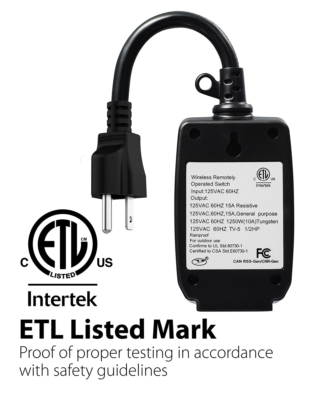 Convenient and Great for Lighting Remotely turn your indoor and outdoor lighting ON/OFF anytime with Fosmon's wireless remote control outlet. It is ideal for seasonal lights and lamps. Conveniently turn your outside lights on from indoors or in your car with its 30 meter (98 foot) range. The pair and un-pair functions will allow you to customize your control freely. Overcome Hard to Reach Outlets Great for turning devices ON/OFF in hard to reach places. Perfect for the elderly and those with limited mobility and back pain. Grounded and Weather Resistant Durable, weather resistant construction for outdoor applications with a grounded 3 prong AC plug that plugs into any standard outlet. Compact Remote Fits comfortably in your pocket, purse, and glove box or on your key chain. Multiple Uses Great for TVs, lighting, heaters, sprinkler systems, terrariums, aquariums, humidifiers, and more. Limited Lifetime Warranty This product includes a limited lifetime warranty. Please visit Fosmon's website for more details. Please note: If using outdoors, be sure to plug into GFCI approved outlet, and hang with outlet hanging down. This will prevent moisture from penetrating into the plug. Multiple plug in outlets (receiver) can be paired to one remote but multiple remotes cannot be paired to one outlet. Specifications: -Max Range in Open Area - 30 meters / 98.4ft -Includes CR2032 Battery for RF Remote -For Outdoor and Indoor Use -Single 125VAC outlet - 15A Max -125VAC,60HZ,15A,Resistive -125VAC,60HZ,15A, General purpose -125VAC,60HZ,10A / 1250W,Tungsten -125VAC,60HZ,1/2HP TV-5 -Fixed Transmitter and Receiver Code -Frequency: 433.92MHz -Operating Temp: -13°F~104°F / -25°C~40°C -ETL Listed Package Includes Outlet Receiver x2 Outlet Remote x2 CR2032 Battery x2