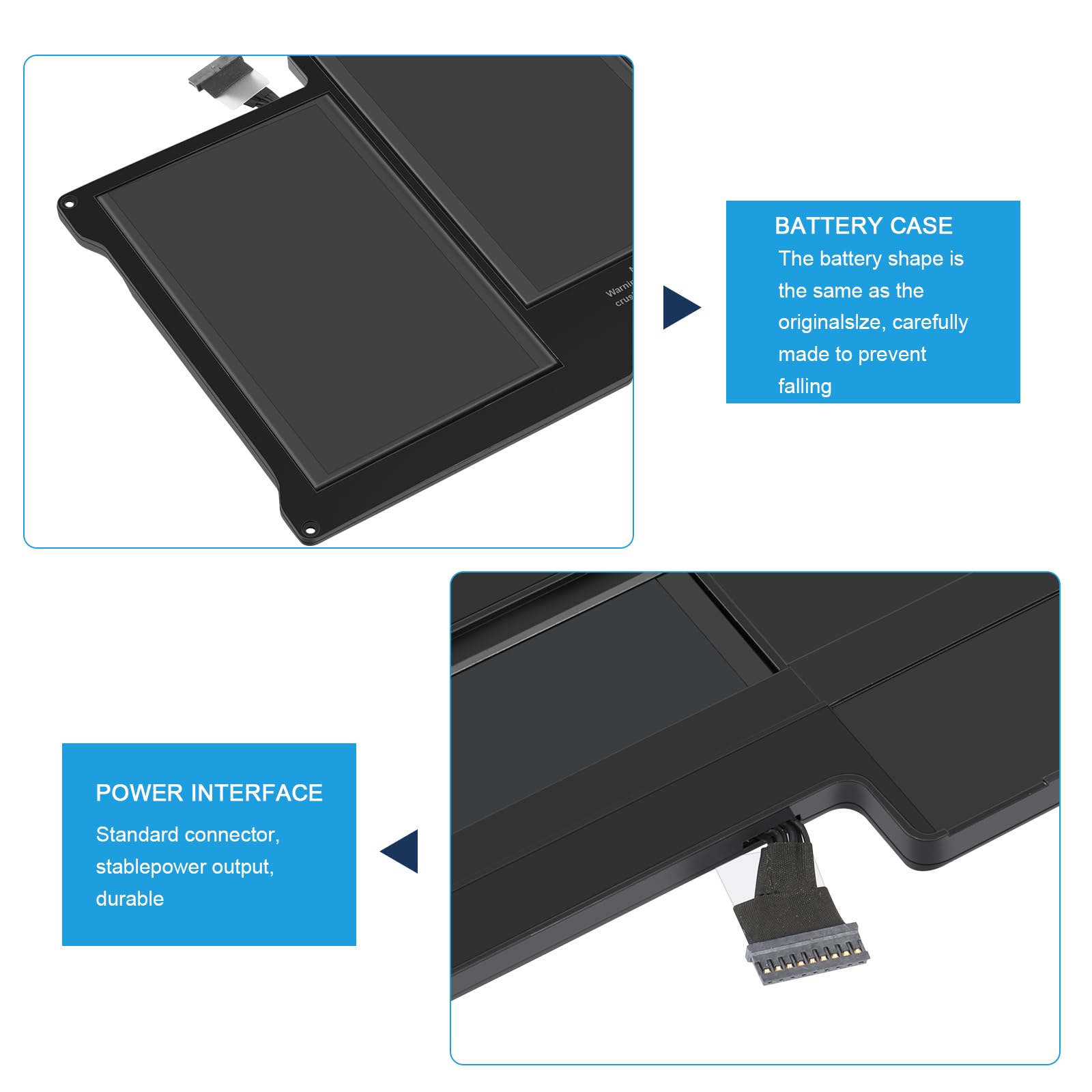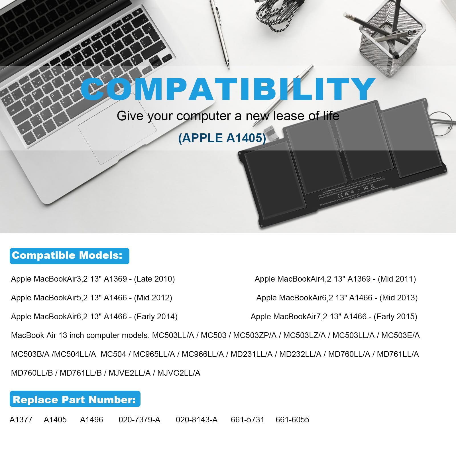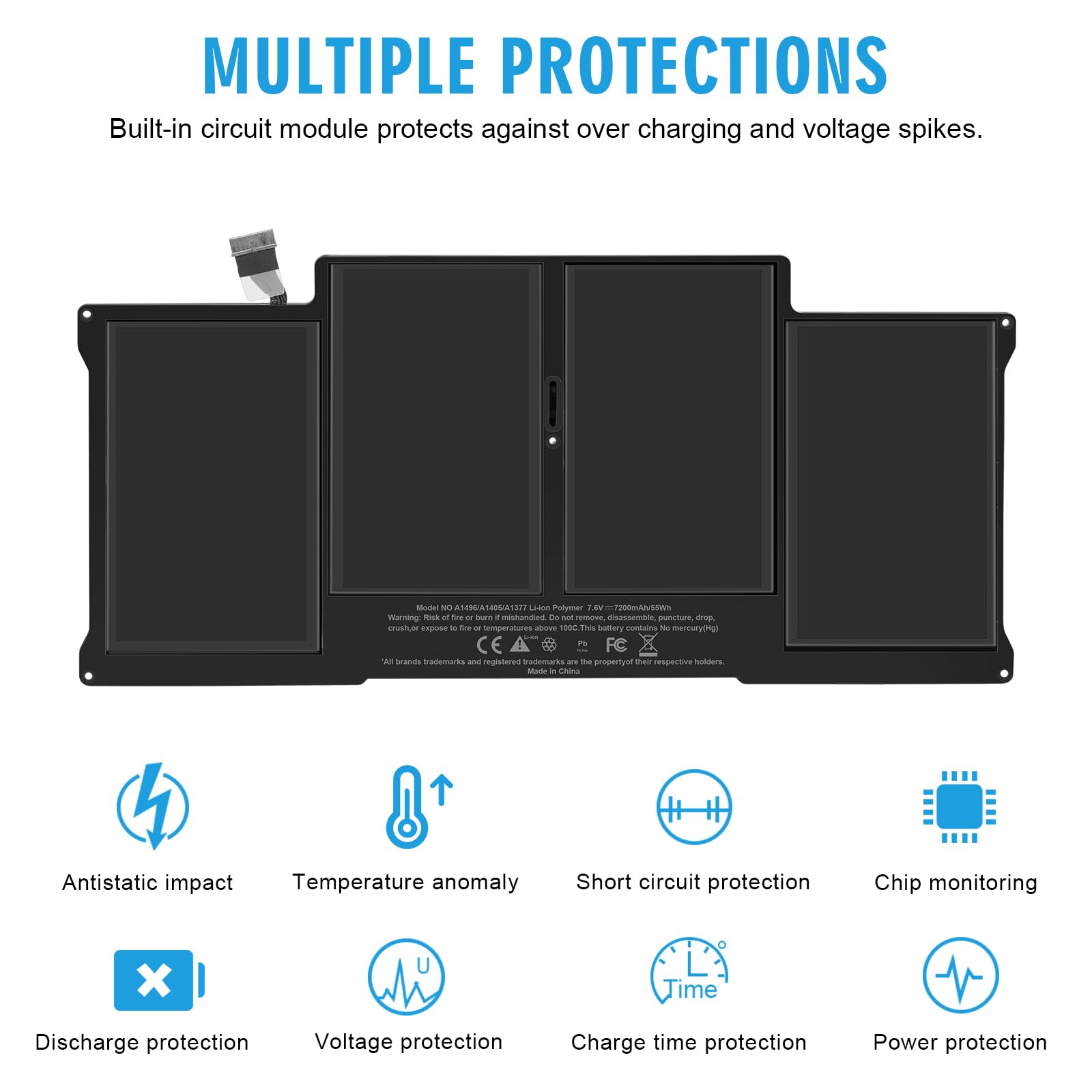 A1496 A1405 A1466 A1377 Macbook Air Battery: 51Wh, Voltage: 7.3V, can up to 500 charging cycles; Manufacturing standard are the same as those of the original battery supplier