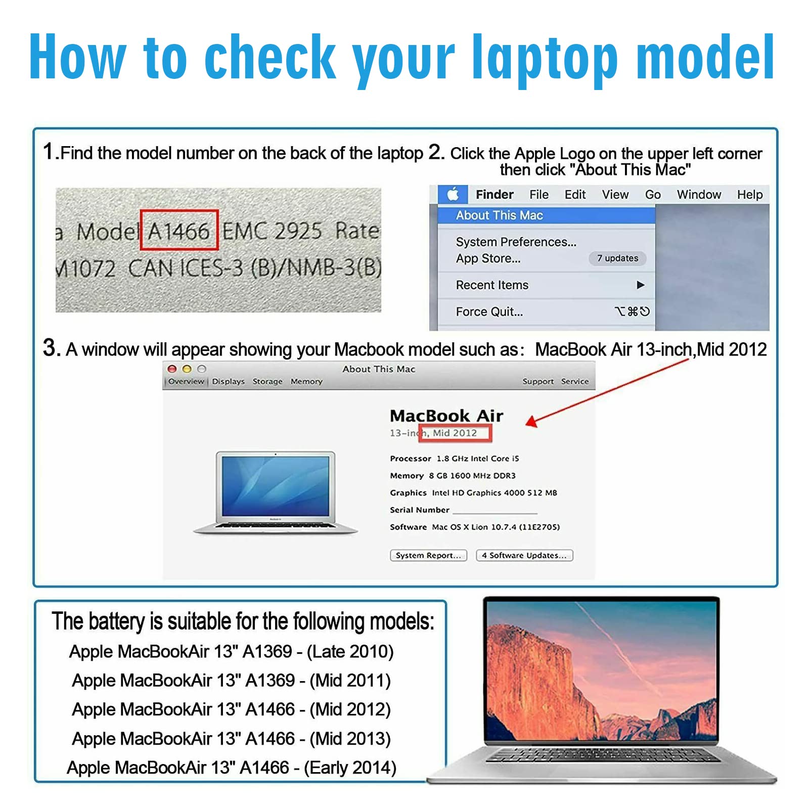 Compatible With MacBook Air 13 inch Computer Model: MC503LL/A, MC504LL/A, MC965LL/A, MC966LL/A, MD231LL/A, MD232LL/A, MD760LL/A, MD761LL/A, MD760LL/B, MD761LL/B, MJVE2LL/A, MJVG2LL/A, MC503LL/A, 【Please Check Your MacBook Model correctly match our battery. You can access this information on your computer by: Logo on the upper left corner of the MacBook screen--> About this Mac】