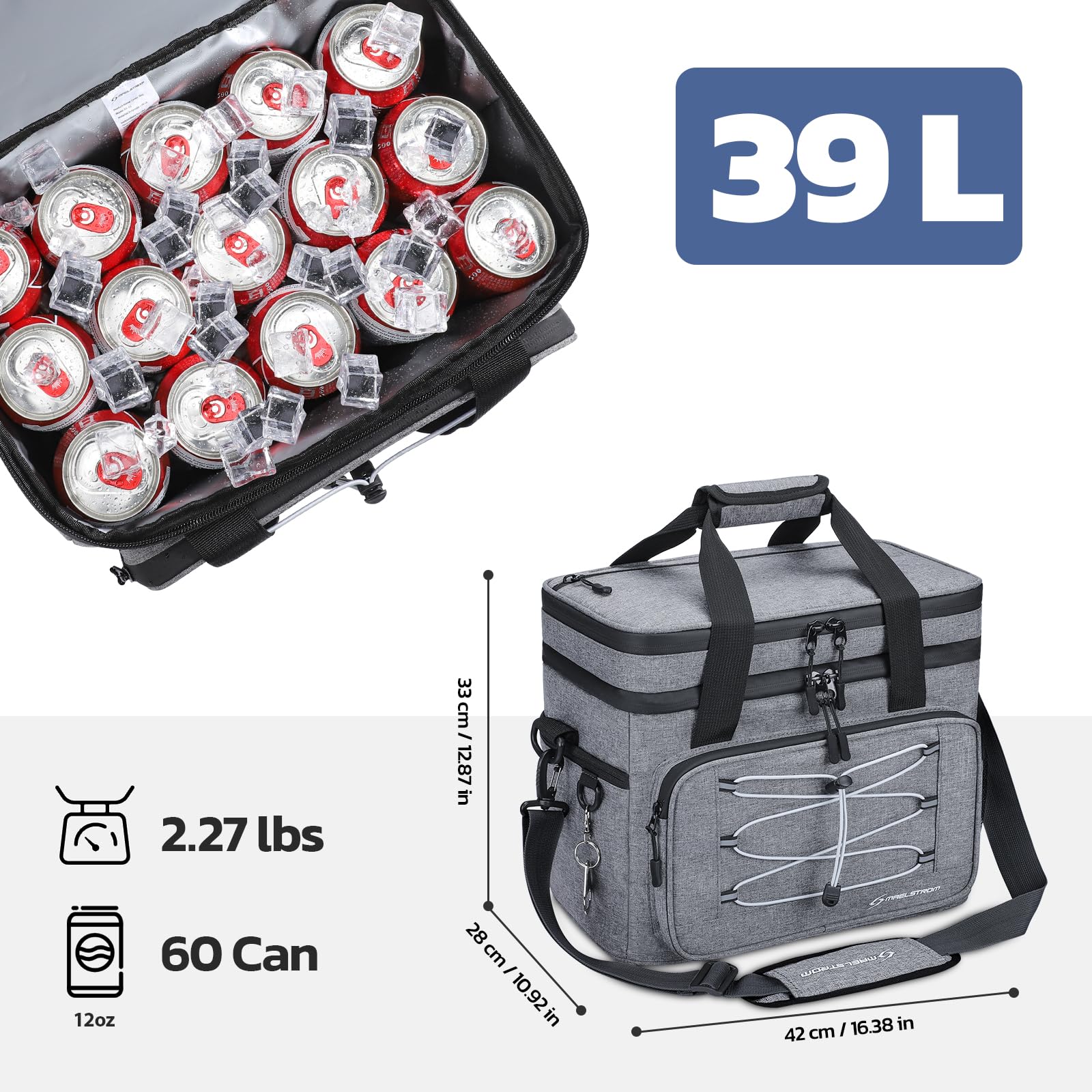 Large Capacity: With dimensions of 15.75*10.24*14.17 inches, this lightweight (2.27 lbs) beach cooler offers a spacious 39L capacity to accommodate all your needs, holding up to 60 cans of 330ml beverages