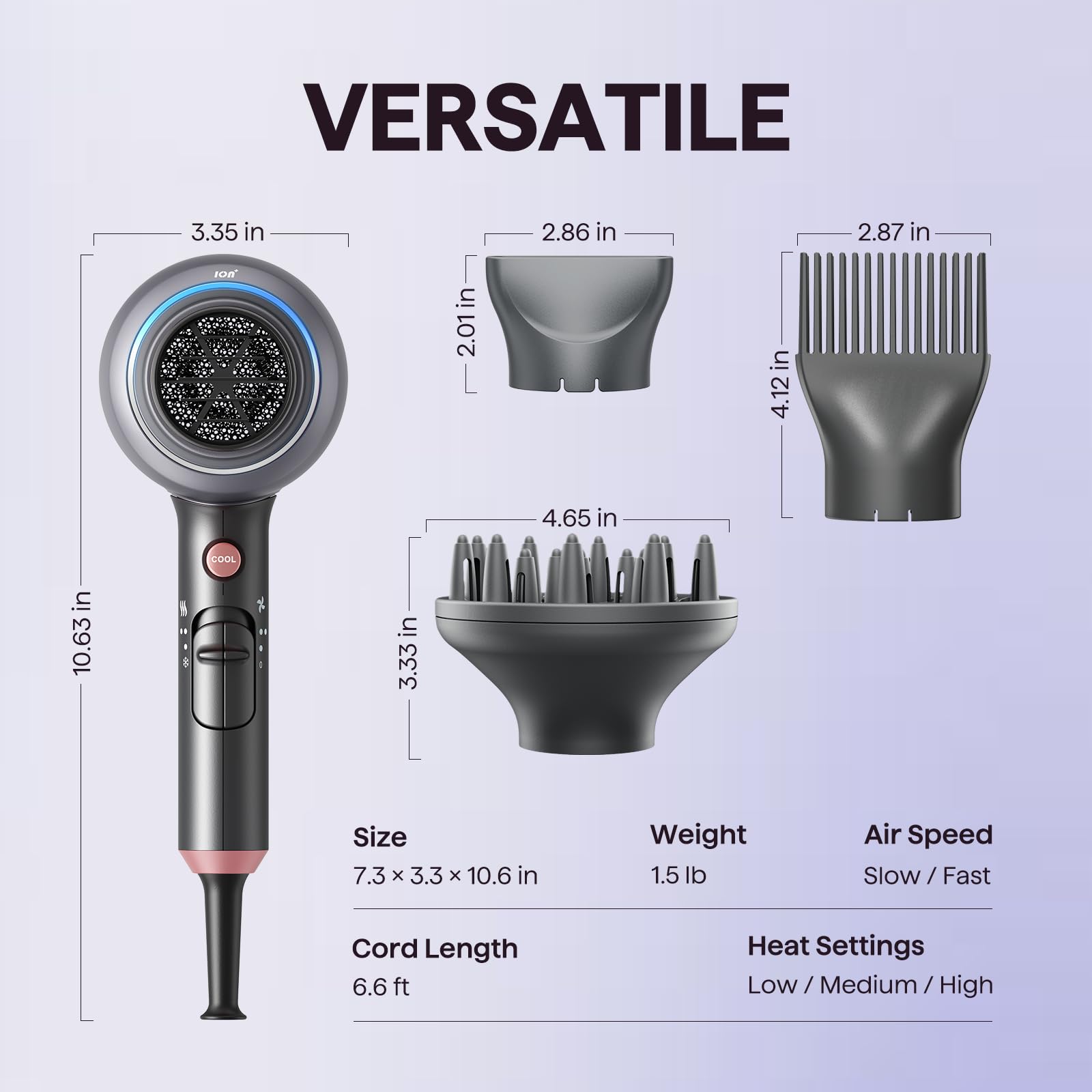 Ionic Frizz Reduction: This hair dryer releases millions of negative ions during use, neutralizing static, taming frizz, and boosting shine—leaving your hair smooth, glossy, and effortlessly polished.