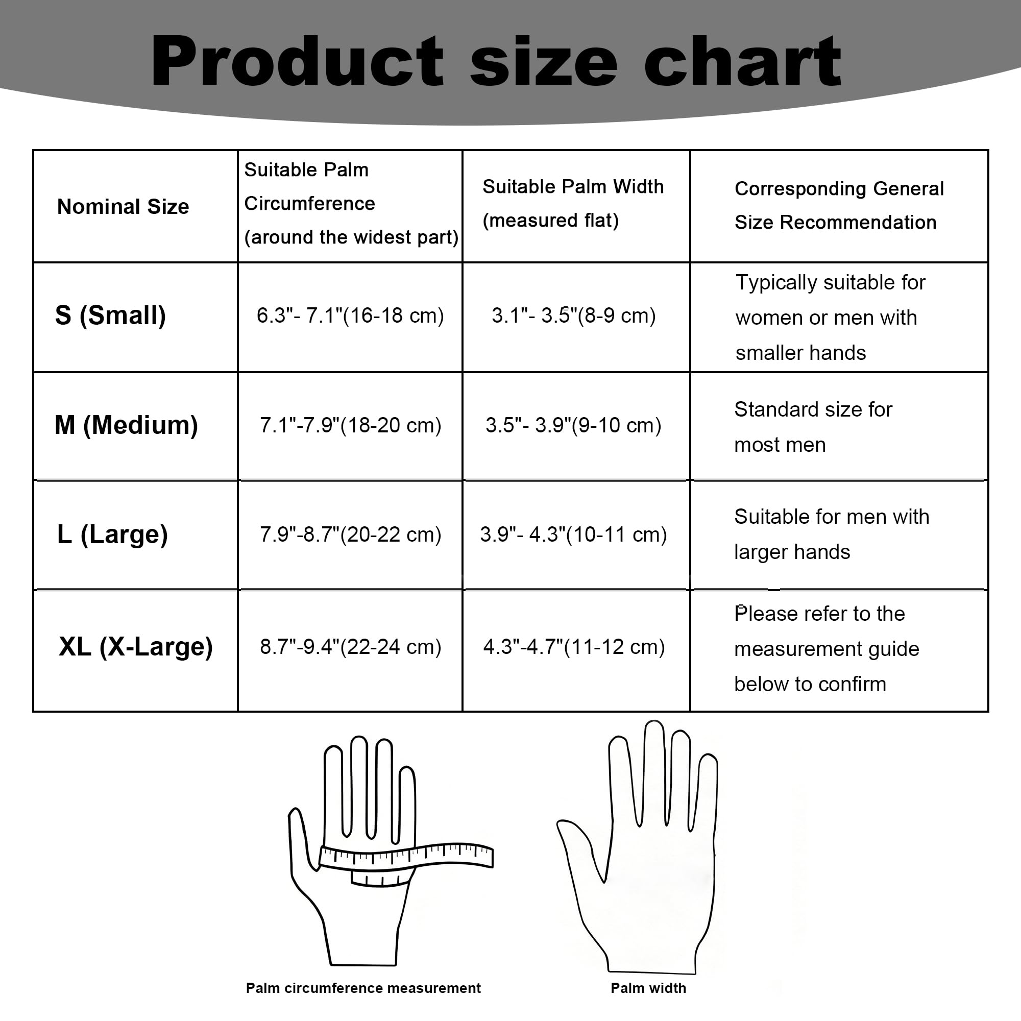 SIZE –S:6.3-7.1 in M: 7.1-7.9 in L:7.9-8.7 in XL: 8.7-9.4 in( Palm Circumference )