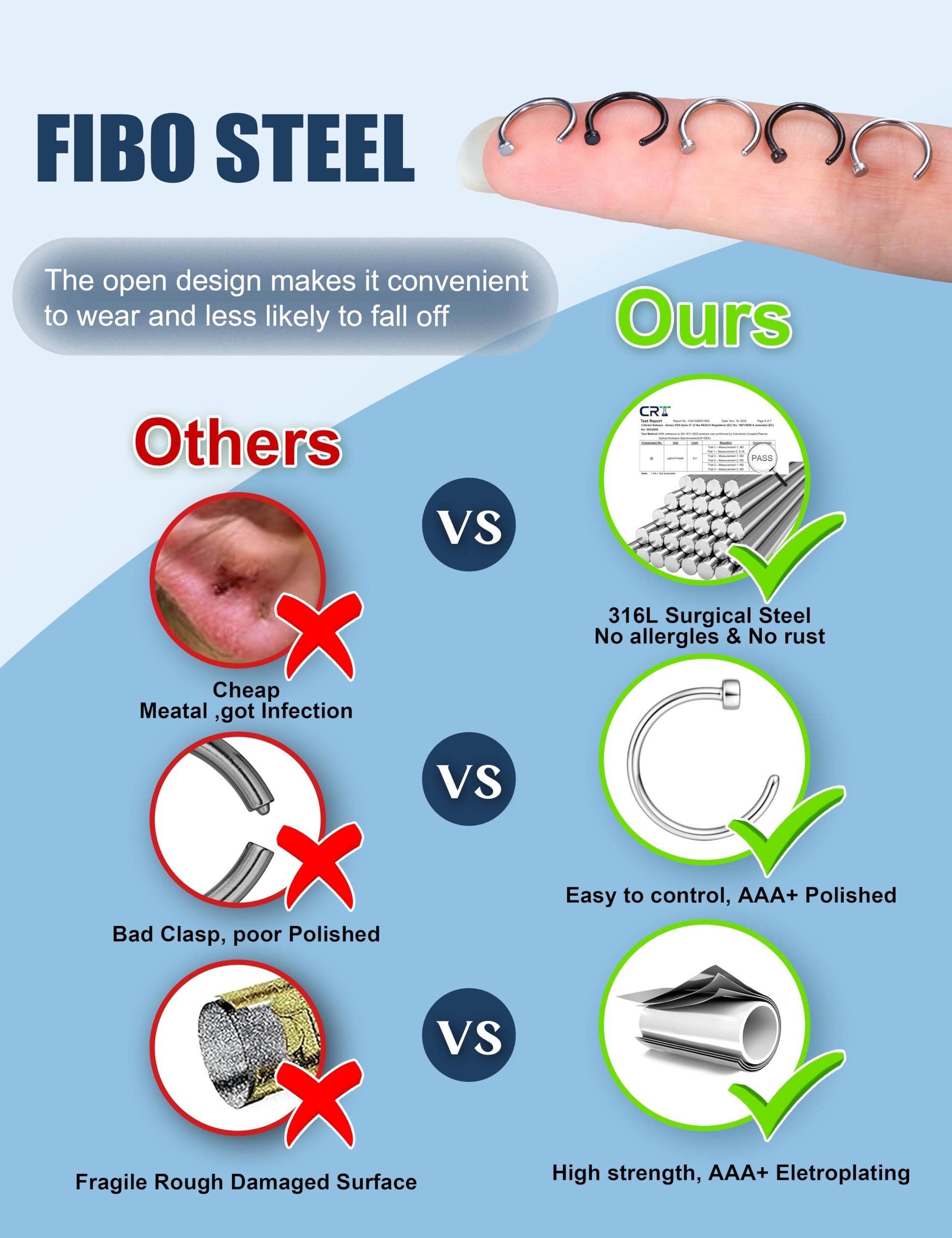 Surgical Steel Nose Rings--Made Of Healthy Safe 316L Stainless Steel,Safe Material; Durable Long Service Time,Comfortable And Non-Allergenic.High Polish Smooth Surface, Comfortable To Wear; Strict Electroplated Process, Insure Well-Distributed Color Plated And Lasting Color Retention.