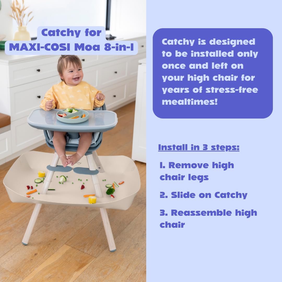 As seen on Shark Tank, our world first patented invention is loved by over 200,000 parents worldwide. No more stressing every time your baby drops food, it is a dream come true for messy meal times! This model is ONLY compatible with the Maxi-Cosi Moa 8-in-1 high chair (HIGH CHAIR SOLD SEPARATELY). See other models for other high chairs. Unlike splat mats, our one time installation is left on your high chair for years of stress-free mealtimes! Catches food dropped or thrown by baby, say goodbye to ruined carpets and stained floorboards. Waterproof and stain proof material. No more bending, sweeping & vacuuming. Simply wipe clean. Made from approved food safe and BPA-free material, so you can save dropped food (that would otherwise get wasted on the floor). Backed by feeding experts, Catchy allows babies to explore their food and make a mess (without causing more stress & clean-up for parents).