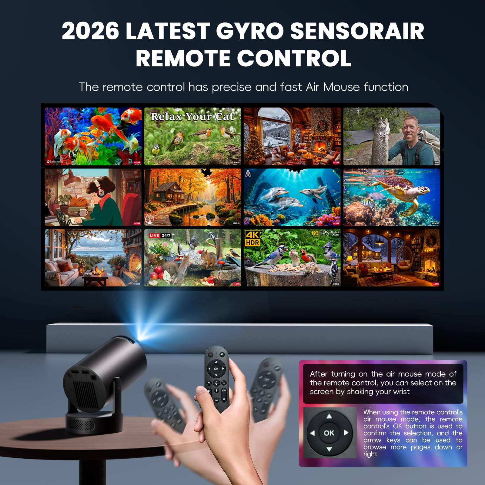 [Projector with Air Remote Function & Built-in Apps] The remote control of the Wowlink W210 portable projector has the Air Remote function based on gyroscope technology. You can control the projector screen by just shaking your wrist. The W210 portable mini projector has built-in applications, compatible with Prime Video, YouTube and D+. You can watch movies and videos with one click without external devices, and start the immersive audio-visual feast of home theater anytime, anywhere