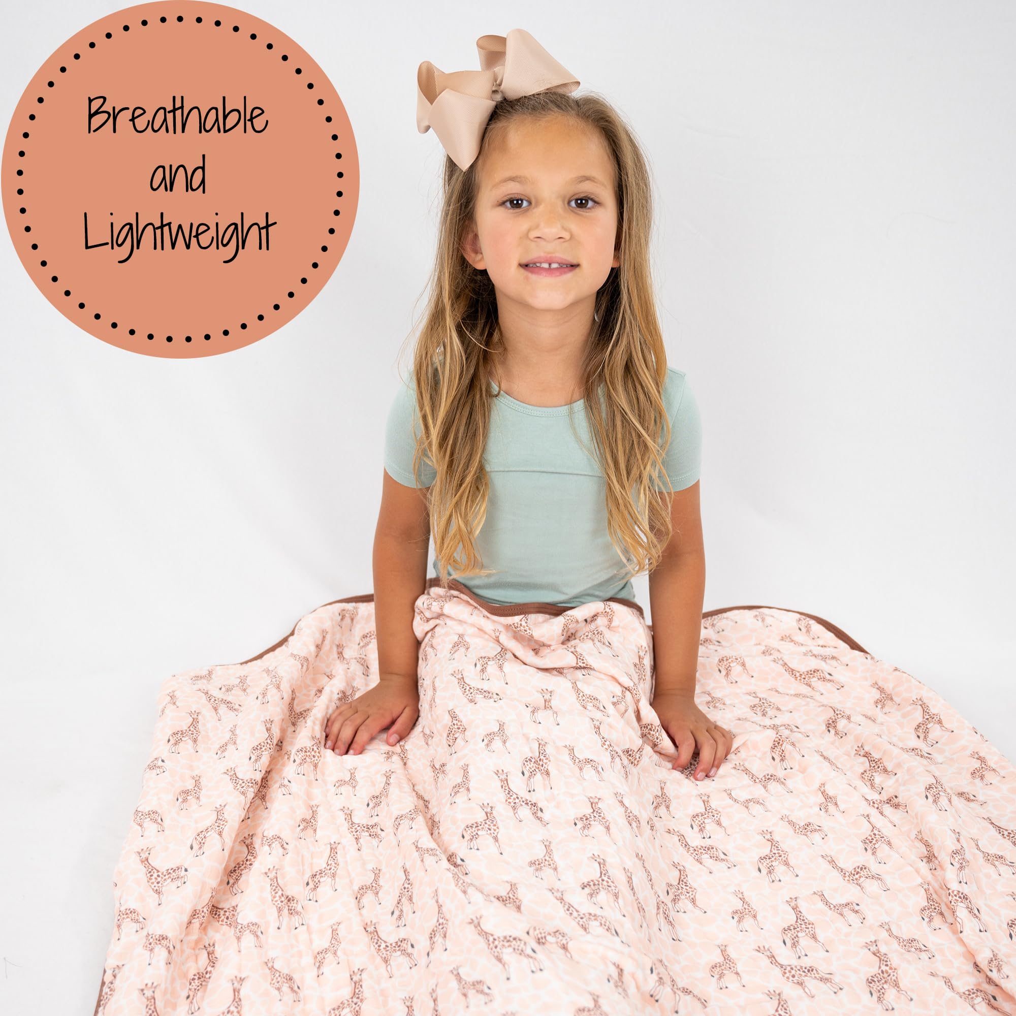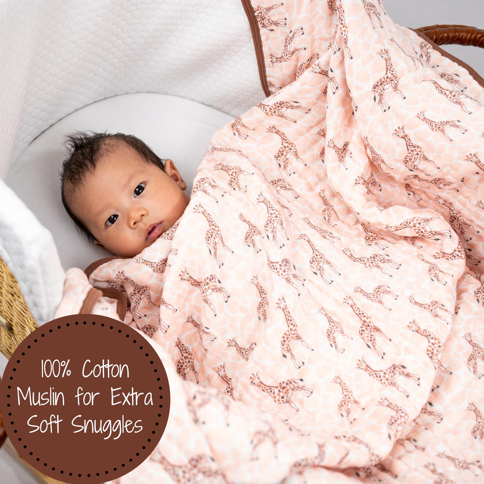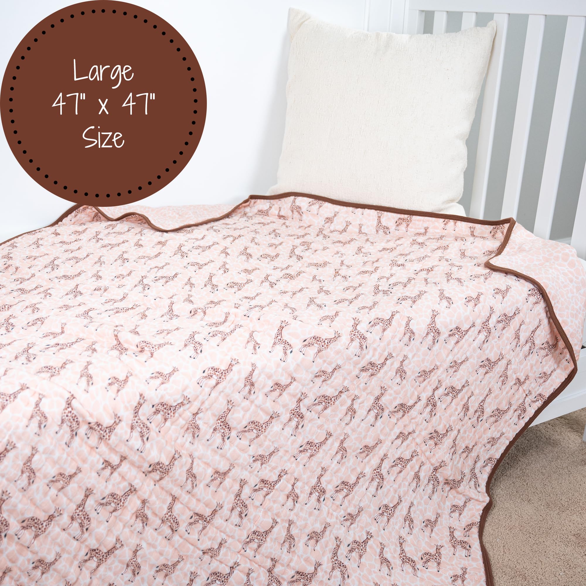 GIRAFFE PRINT - Colorful giraffes parade across this muslin quilt, adding a playful safari vibe to your baby’s world. Perfect for snuggles, naps, and stroller rides with breathable softness