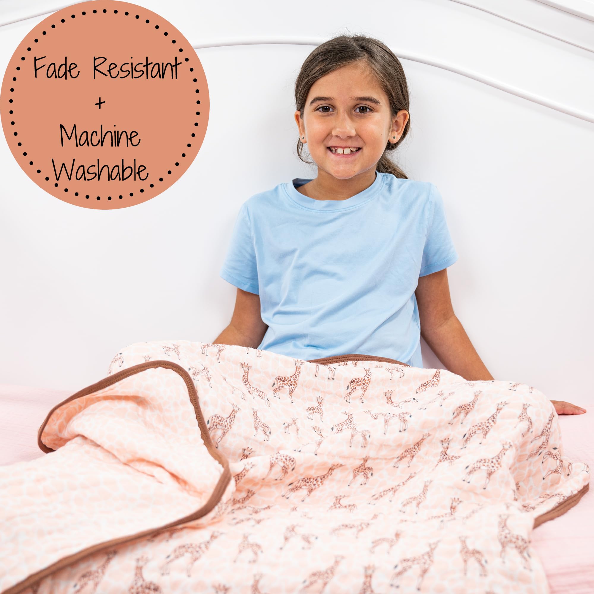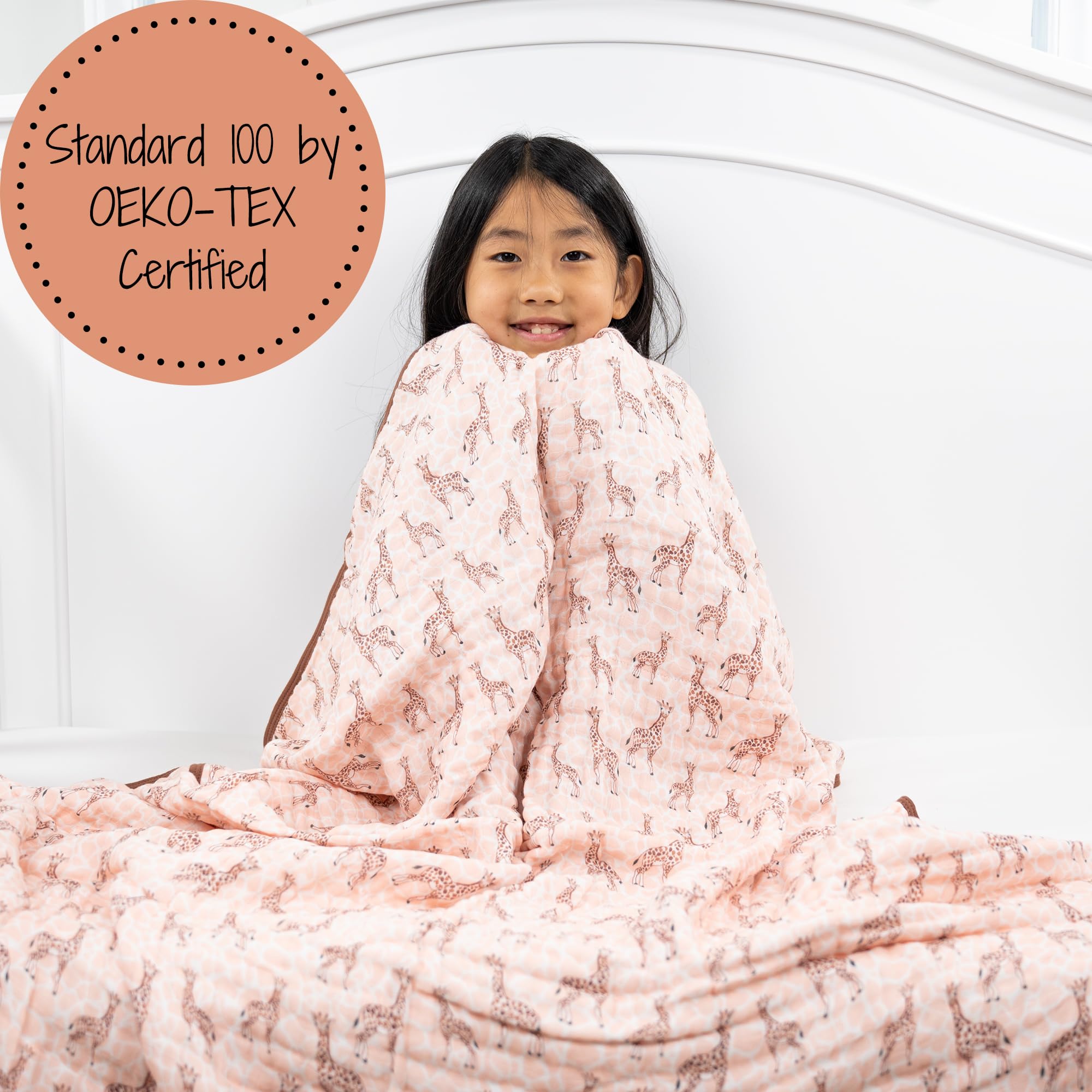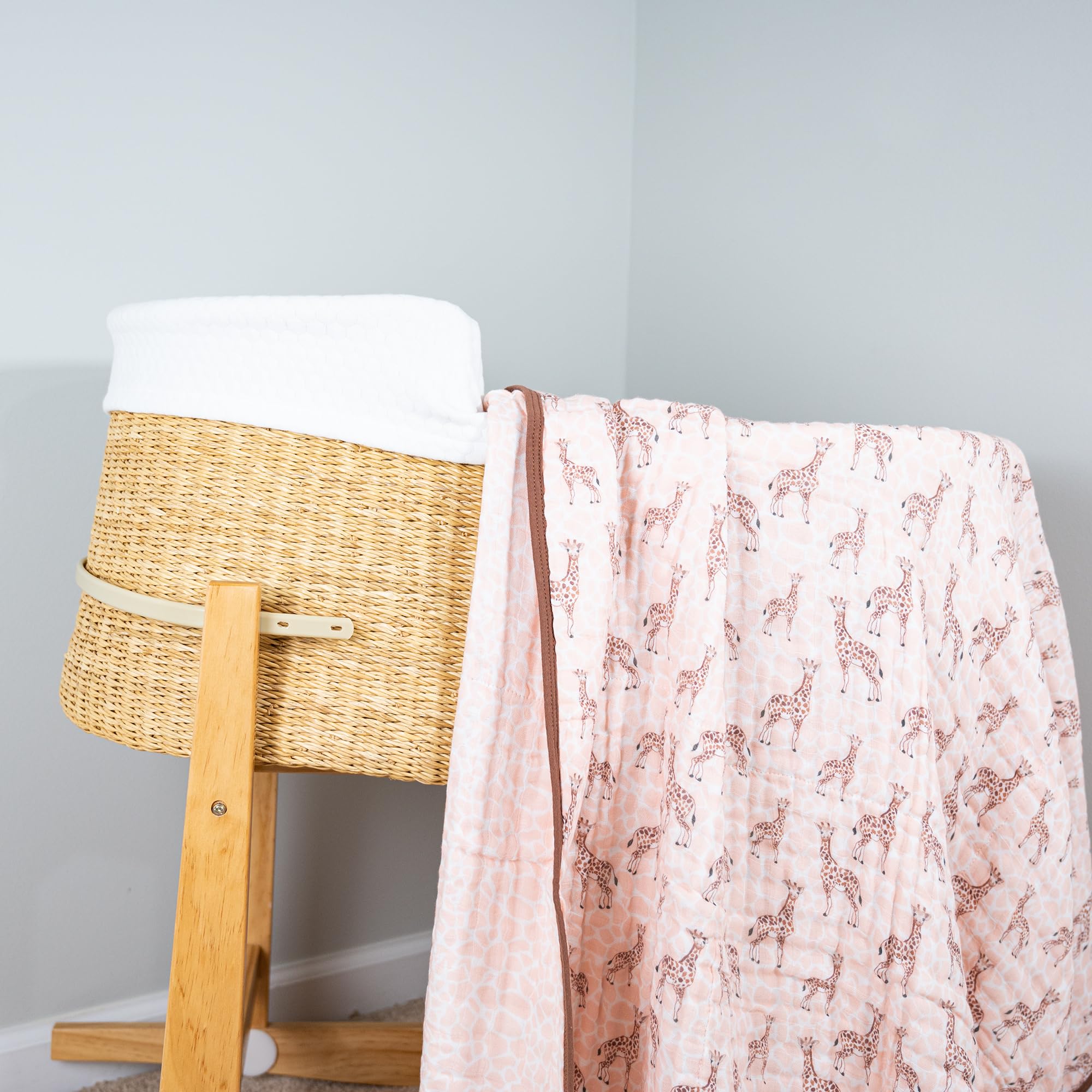 GIRAFFE PRINT - Colorful giraffes parade across this muslin quilt, adding a playful safari vibe to your baby’s world. Perfect for snuggles, naps, and stroller rides with breathable softness