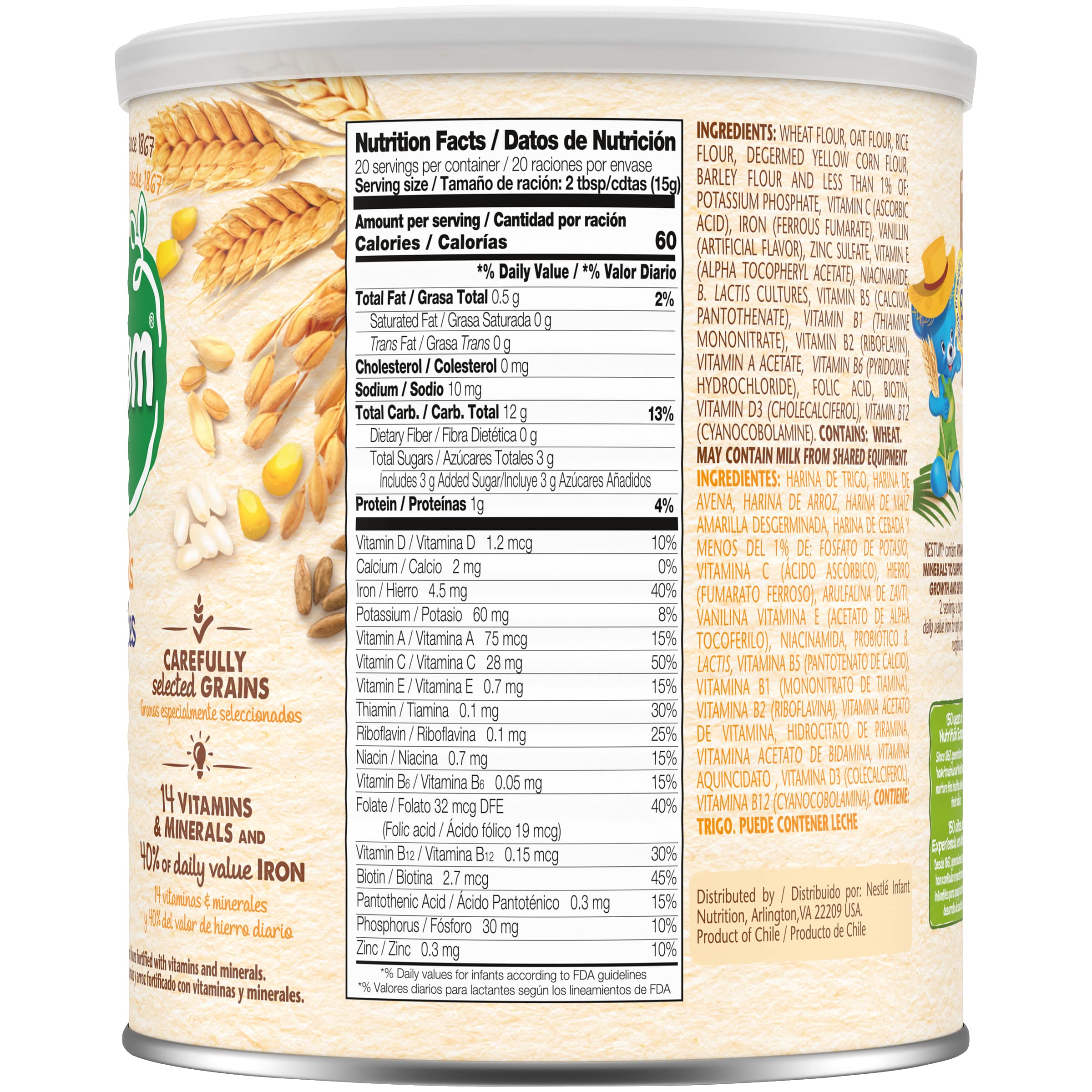 Nestle Nestum Infant Cereal, Wheat & Honey, 10.6 Ounce Canister: Crafted with delicious ingredients to help your little one blossom. This Nestum cereal contains carefully selected grains with 12 vitamins and minerals and 60% daily value of Iron. Great to help support healthy development for your baby. Nestum is made with wholesome grains and vitamins and minerals to support healthy growth, including iron to help support brain development and learning ability. Our cereals are made with wholesome ingredients. Also, they are easy to prepare for a satisfying cereal for your little one. With a range of cereals made for little ones from 6-12+ months, there’s a Nestum product to help nourish little tummies of all ages. This Nestum cereal is made for babies 12+ months.