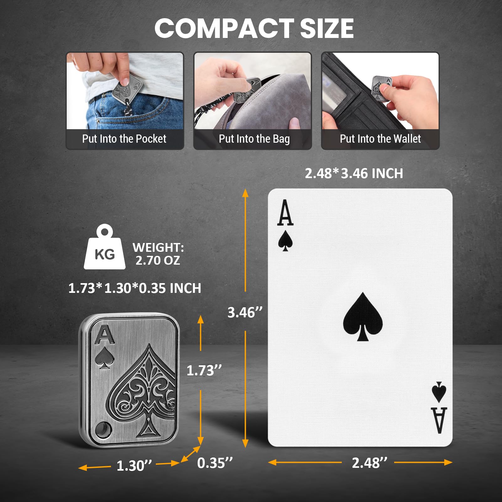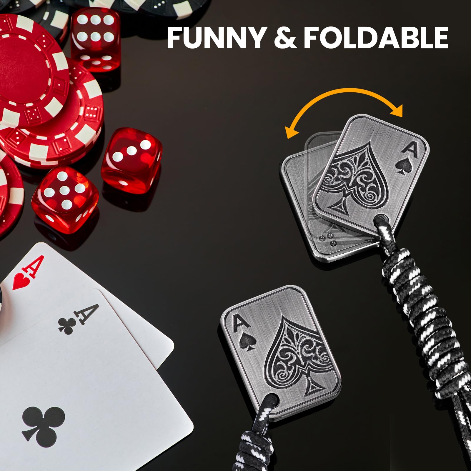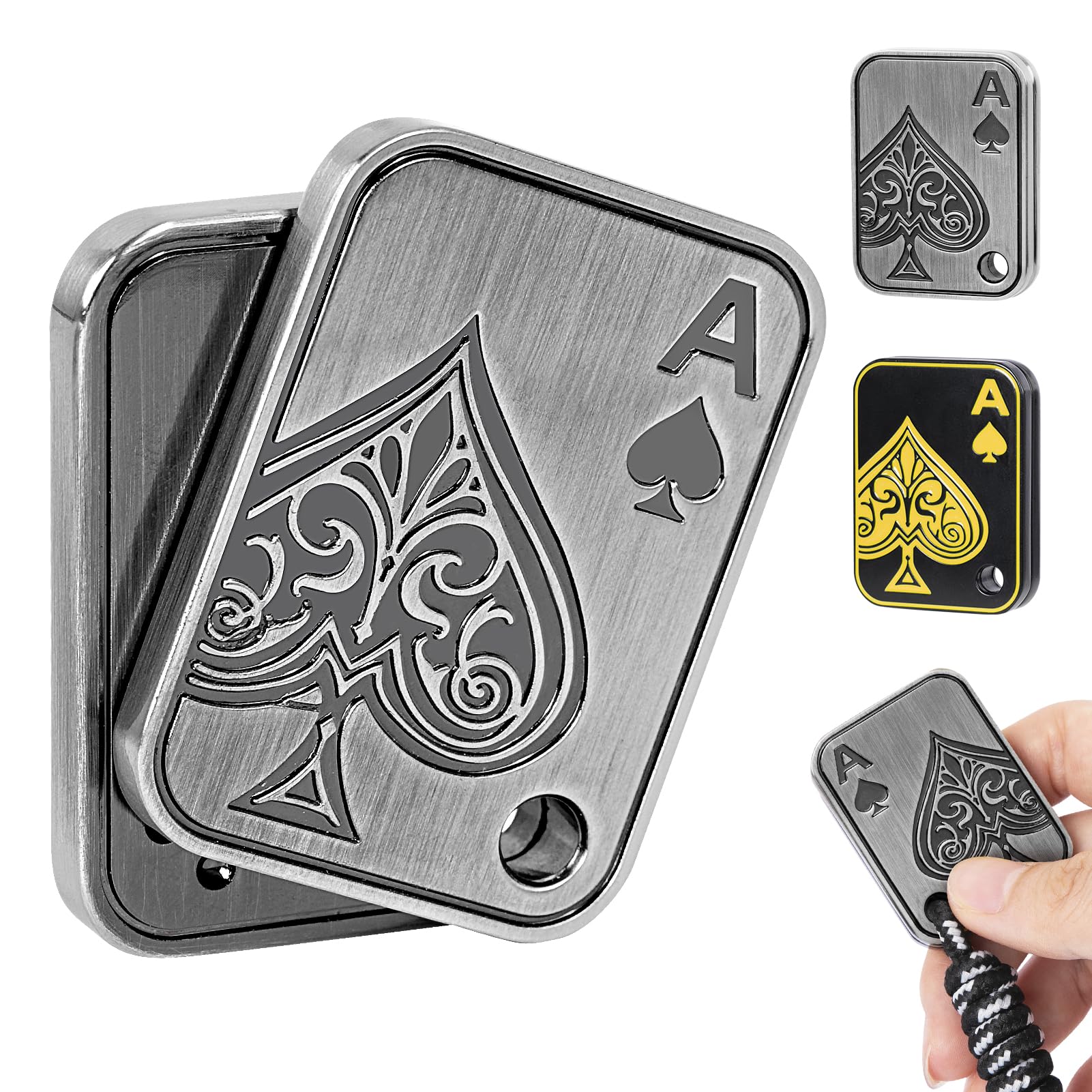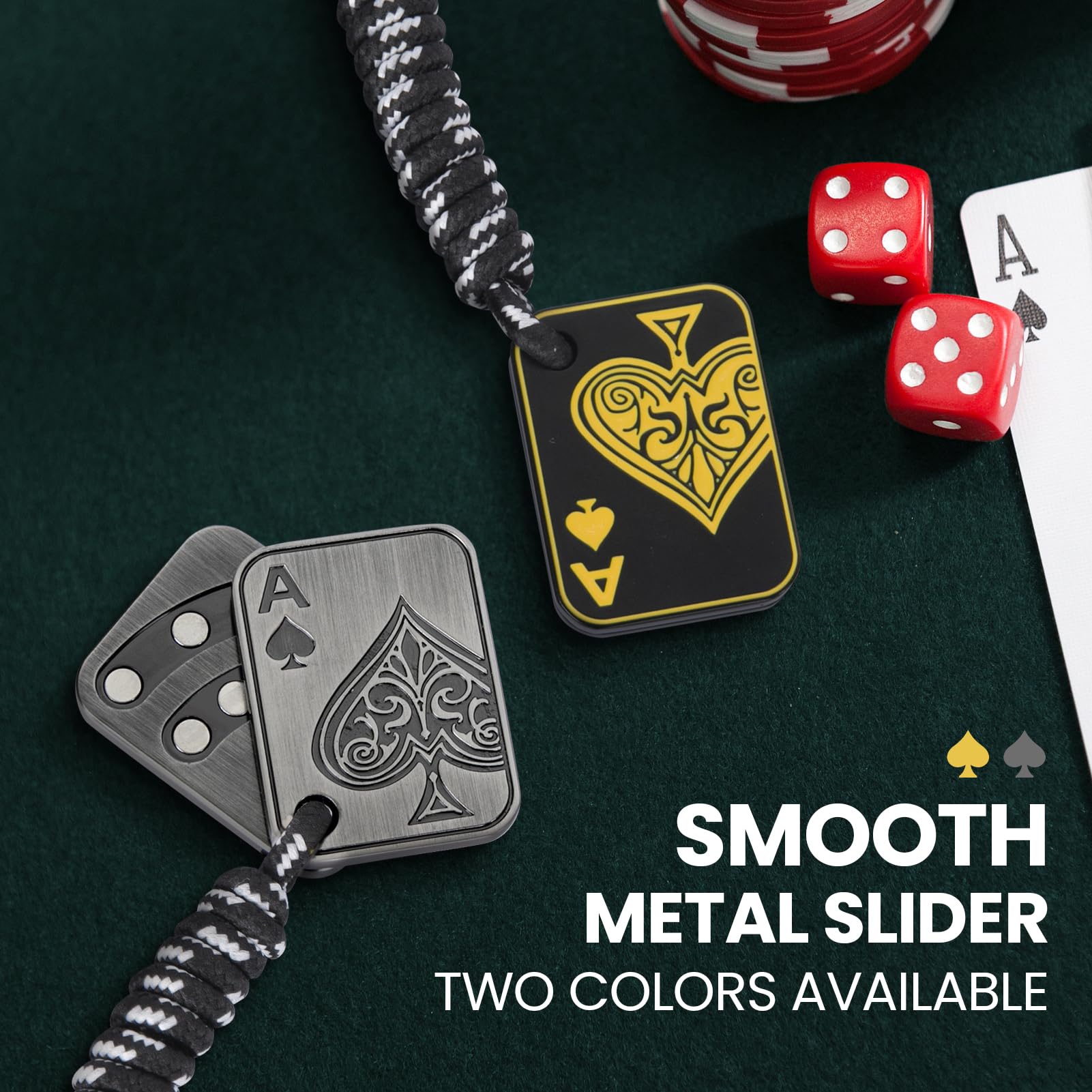 Metal Poker Card Fidget Toy: This magnet fidget is cast in high quality metal and has a carefully engraved surface with the delicate Ace of Spades design from playing cards. It's solidly embedded with 8 small magnetic beads that slide in sections, and the force between the magnets gives a magical feel and experience. It is as fun to gently unfold and close in your hand as it is to shuffle the poker cards.