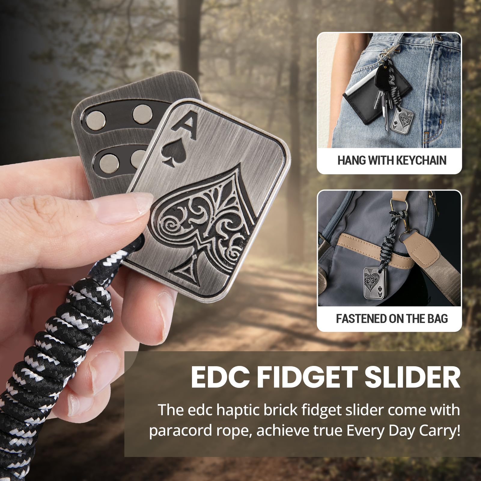 Upgraded with Paracord Rope:This fidget toy adds the design of a sturdy paracord rope that attaches to two metal sliders that won't come apart. With this rope, the string can be strung around your finger and you can easily enjoy playing with the metal fidget toys. In addition, it can also be hung on a backpack, keychain or trousers as a fashionable hanging decoration that can be carried around or as a desk toy decoration.