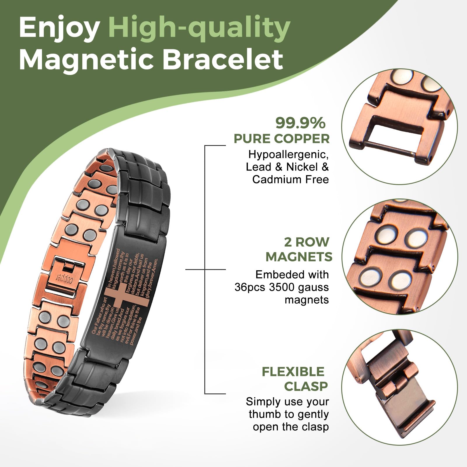 [Superior Magnets]-Our copper bracelet is equipped with 40 powerful neodymium magnets, each with a magnetic force strength of 3500 gauss. These magnets can promote blood circulation, improve sleep, boost energy, and relieve fatigue. Your body will appreciate this completely natural and non-invasive method for improving your health!