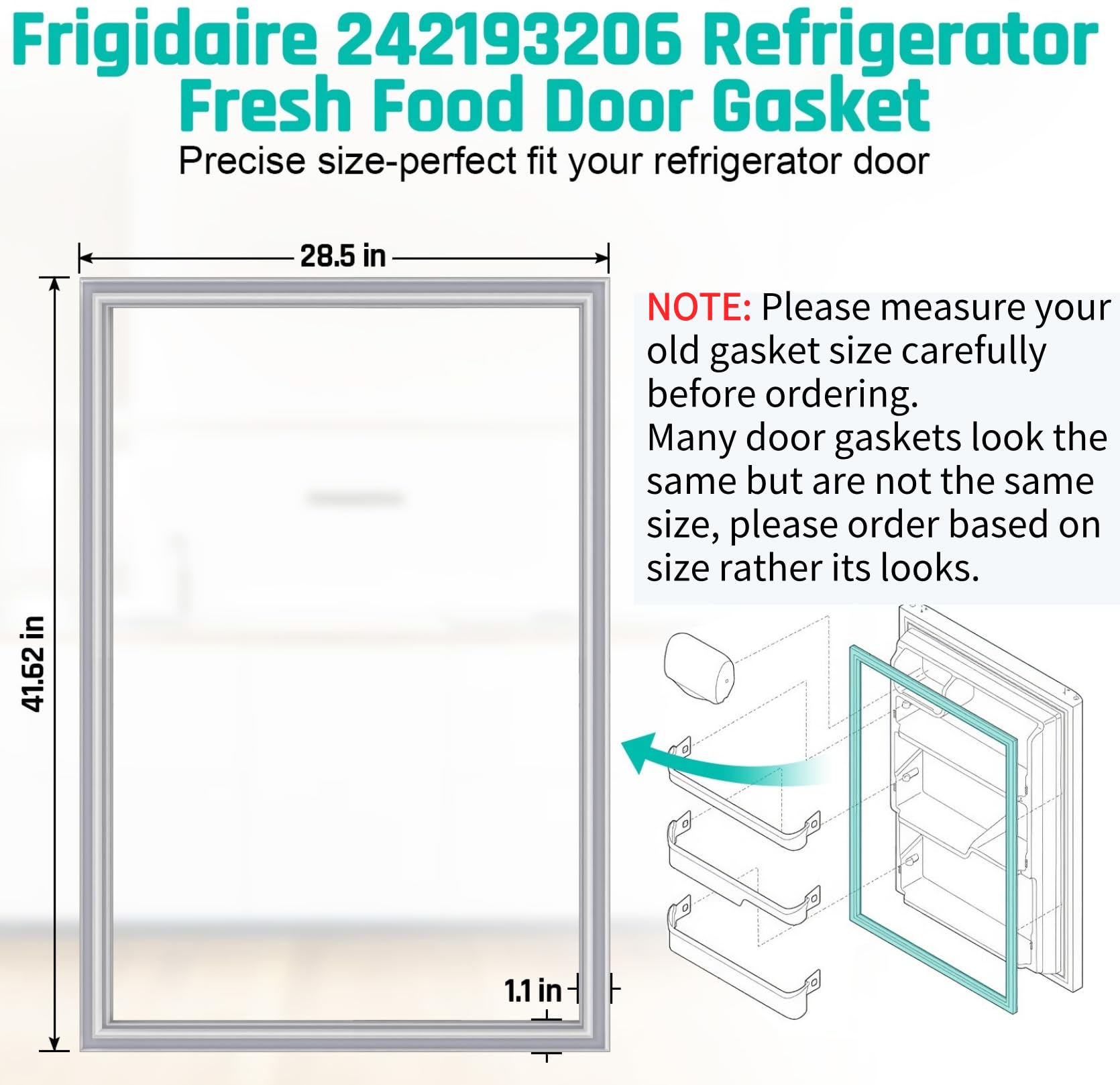 [Specification Size] Luckman 242193206 refrigerator freezer door gasket replacement approximate size is: 41.6''x 28.5", please measure your old gasket size carefully before ordering. Many door gaskets look the same but are not the same size, please order based on size rather its looks. NOTE: Smooth folds and creases in gasket 242193206 by soaking it in warm water or warming it with a hair dryer on low heat.