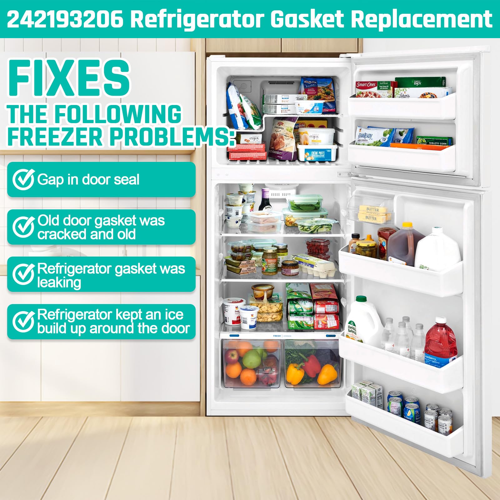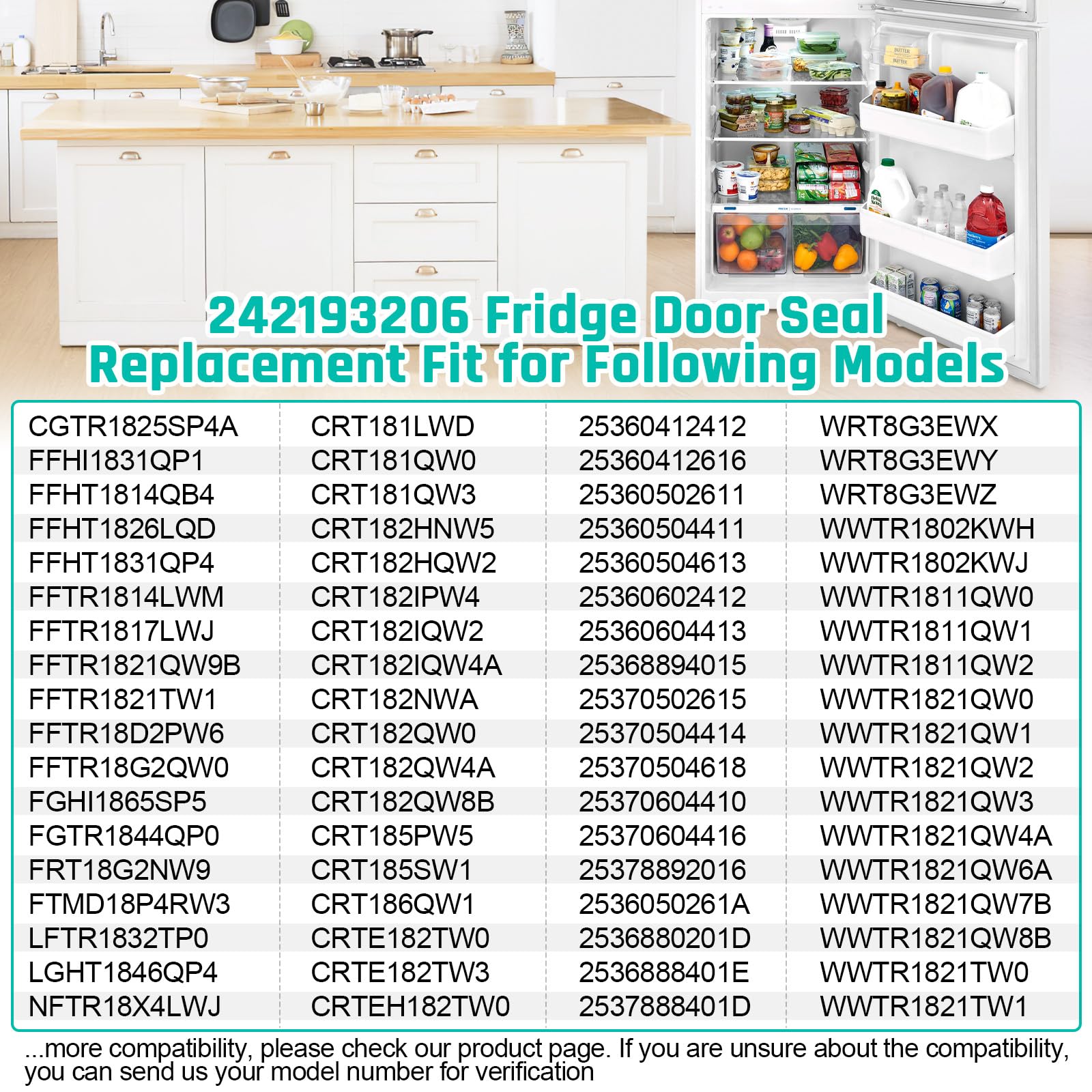 [Wide Compatibility] 242193206 Fridge door gasket compatible with Fri-gidaire, Ken-more, Cro-sley, White-Westinghouse . Including CRT181QW3 CRT182HQW4 CRT182IQW4A CRT182NWB CRT182QW8B CRT186QW2 FFTR1814TWH FFTR1821TW0 FFTR1831QP2 FGHI1865SP5 FGHT1848PF3 FGTR1845QP1 FTMD18P4TW0 LFHT1831QP0 LFTR1832TP2 NFTR18X4QW4A 25360412611 25360504411 25360604411 25370502414 25370502618 25370602413 25378894016 2537050261A WWTR1811QW0 WWTR1821QW3 WWTR1821QW8B ...more compatibility, please check our product page. Before purchasing, check your device's model number to ensure compatibility.