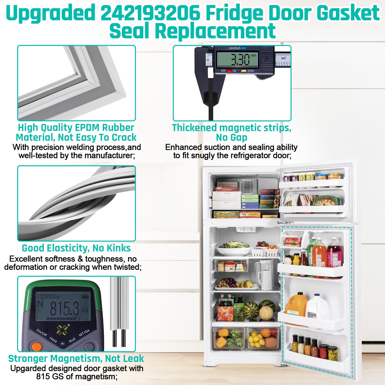 [Upgraded 242193206 Door Gasket] Upgraded 242193206 Refrigerator Door Gasket is made of High quality EPDM rubber with precision welding process,1600 degrees fahrenheit high temperature welding. Featuring Cold resistence, high elasticity and flexibility, can quickly return to its original state after deformation, no kinks and smooth flat crisp edges.