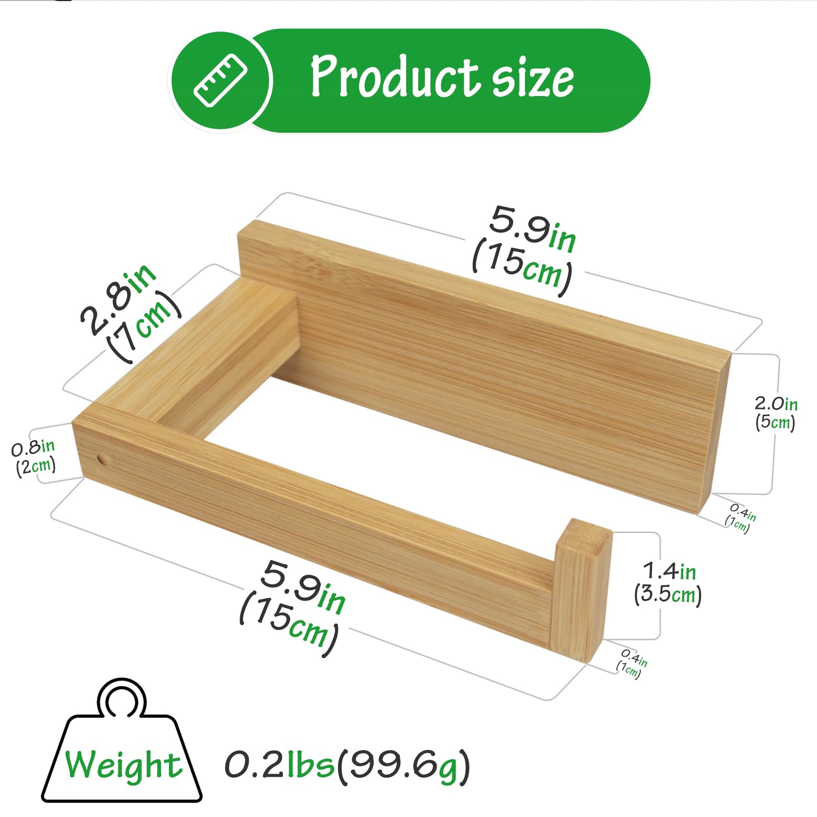 Package: 1 piece toilet paper holder, one pack of screws, one self-adhesive sticker Size: 5.9 inches x 3.54 inches x 1.97 inches Material: The wall-mounted toilet paper holder is made of 100% bamboo, varnished surface, rust-proof, corrosion-resistant Installation: You can use the sticker as a self-adhesive toilet paper holder, or you can use the matching screws to drill holes for wall hanging Use: It can be used as a toilet roll holder and hand towel holder, or it can be used to hang light clothes, or it can be used as a kitchen rag hanger, the bamboo paper towel holder itself is also beautiful and can be used to decorate your home