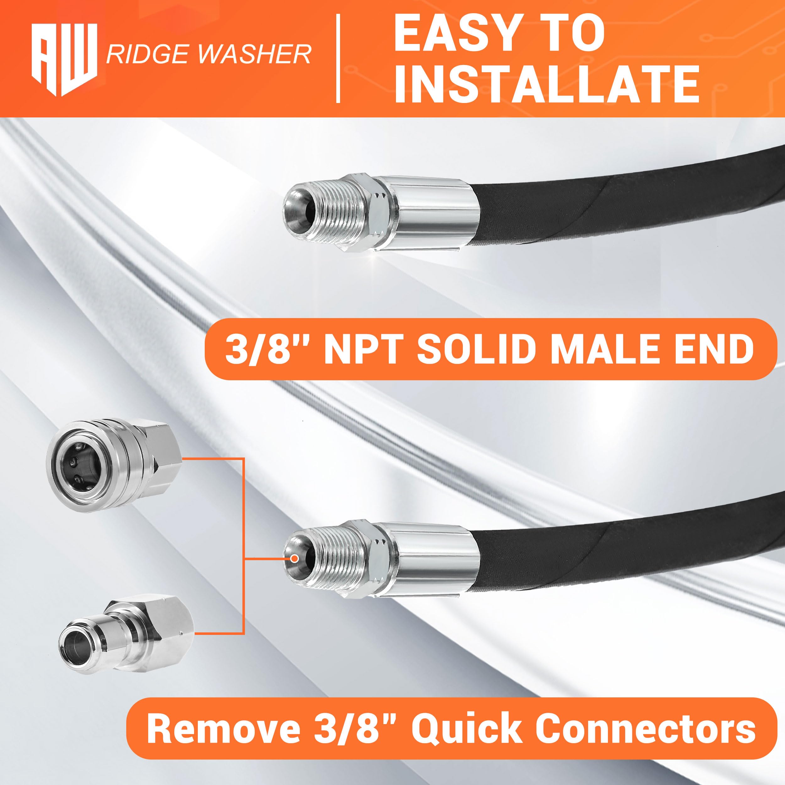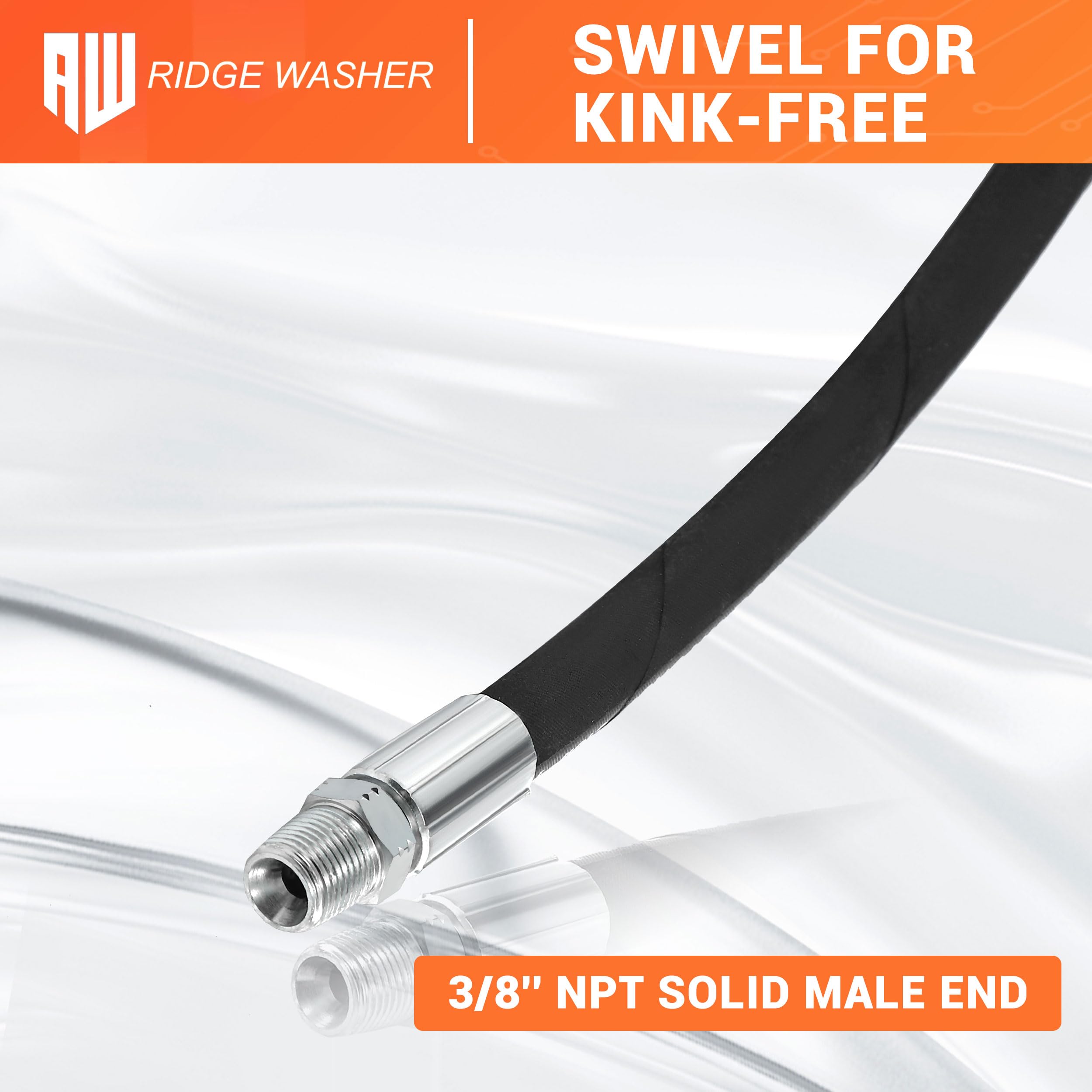 𝐄𝐗𝐓𝐄𝐍𝐒𝐈𝐕𝐄 𝐀𝐏𝐏𝐋𝐈𝐂𝐀𝐓𝐈𝐎𝐍: Pressure hose whip line features a 3/8'' NPT solid male end and a 3/8'' NPT swivel male end. This high-pressure whip hose fits most hose reels and can easily solve your problem when you need to connect the pressure washer pump with a pressure washer hose reel or any other equipment you require