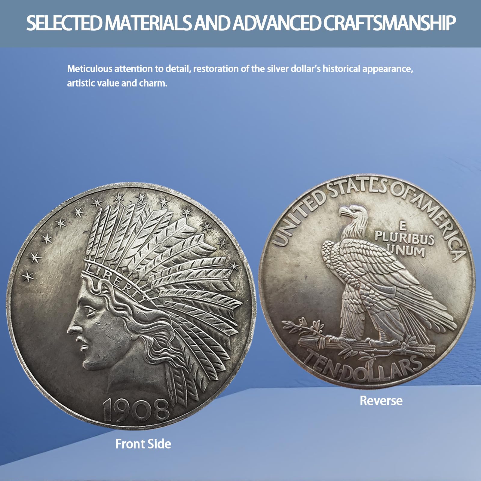Advanced Craftsmanship: This coin masterfully combines materials science with numismatic expertise. Meticulous attention to detail, precision die-casting, and vintage handcrafting techniques faithfully recreate the historical appearance of the silver dollar, making it a stunning work of art.