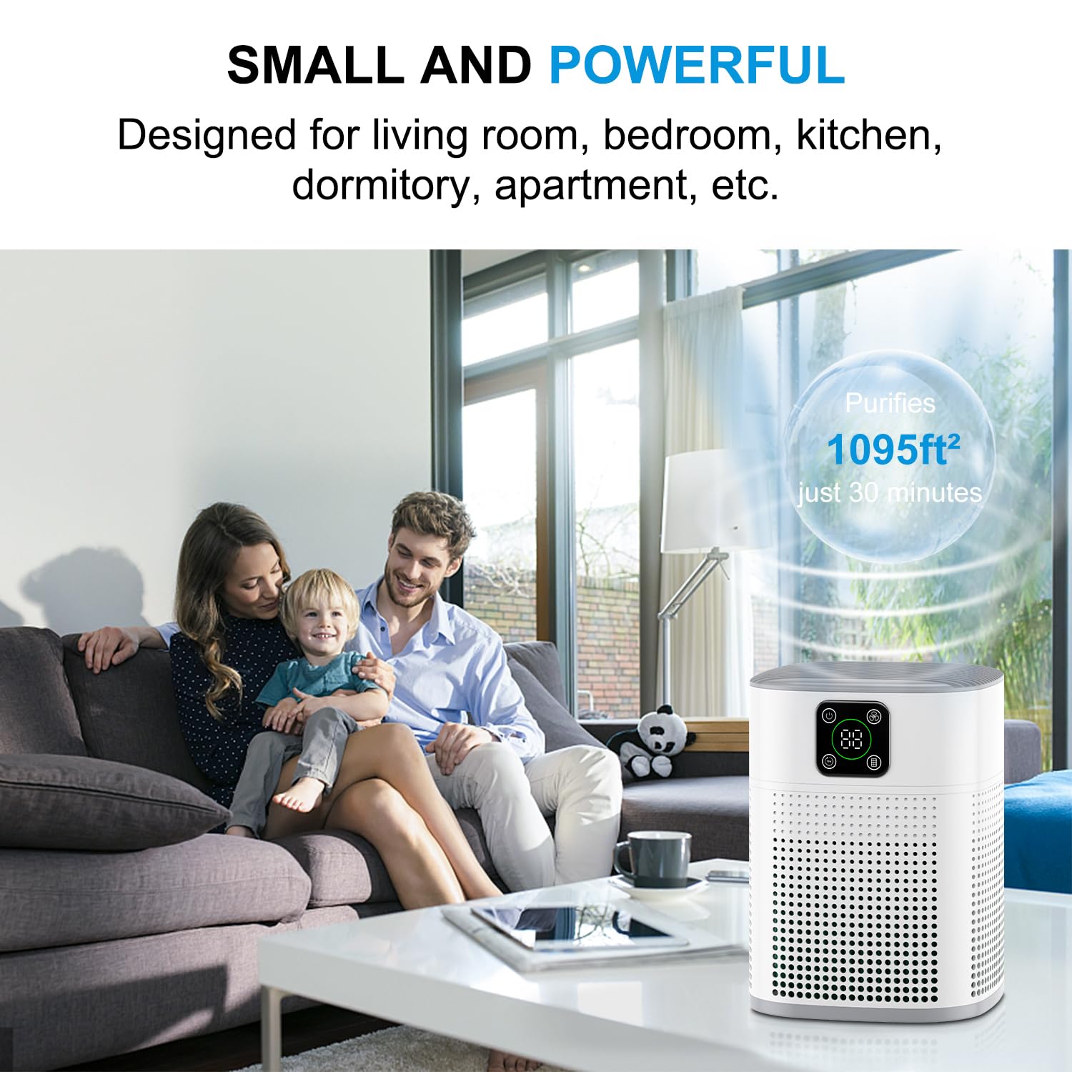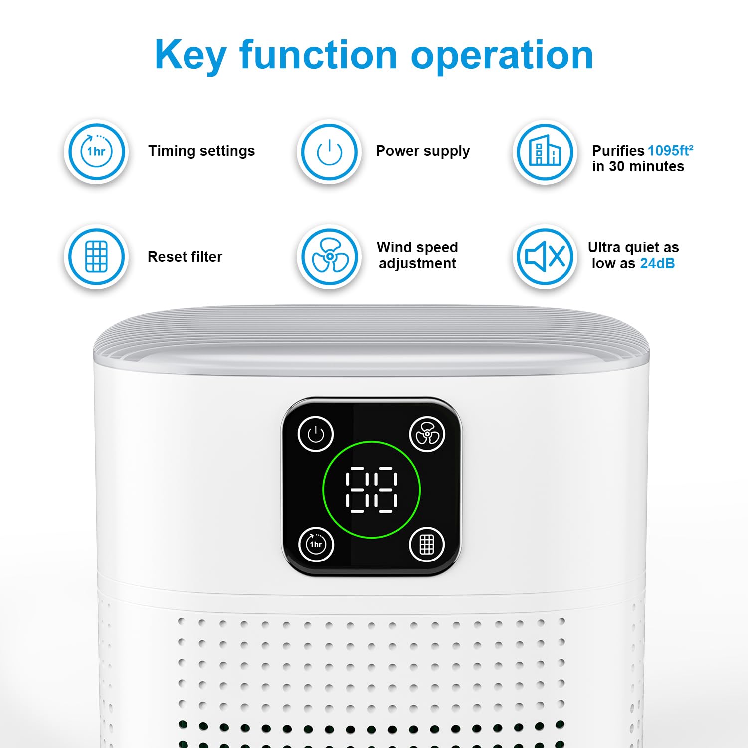 🔥【Portable & Smart Design】 Air purifiers for bedroom is portable and powerful, completely refreshed air in just 30 minutes in 1095 sqft, and powerfully deliver clean air 90-120m³/h; Meanwhile our air cleaner is with LCD touch display, function with 3 Fan Speeds, 9 timer options, sleep mode, filter replacement reminder, You can easily operate it only by the indication icons on the screen.