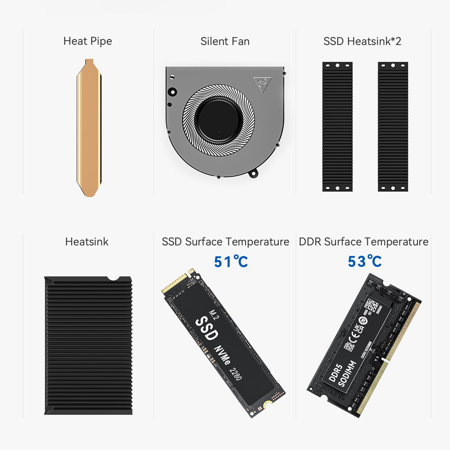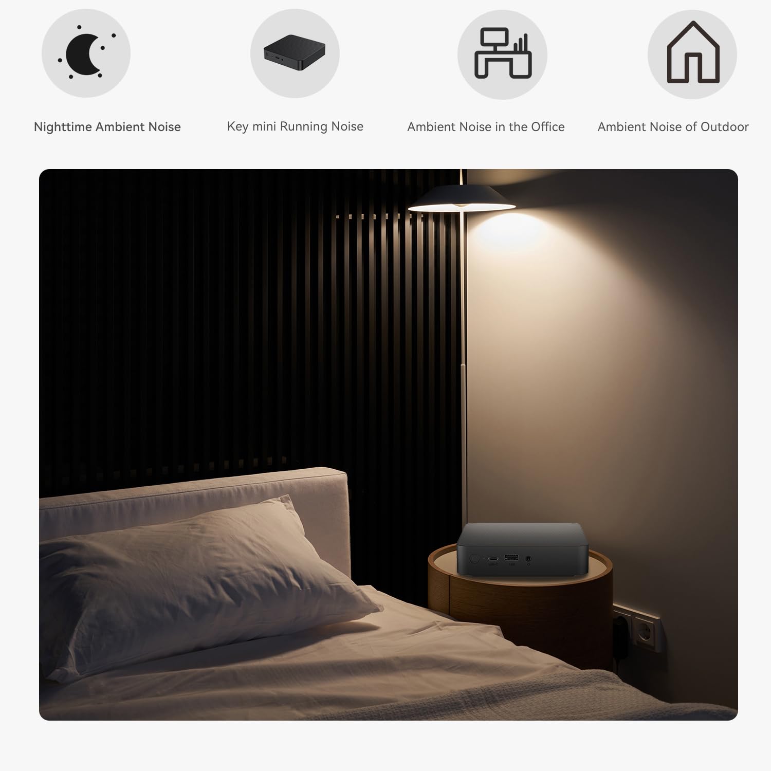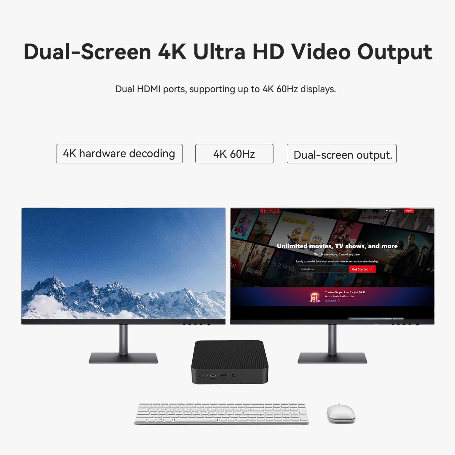 【Dual Display + Quieter】Intel N100 mini pc is equipped with Intel UHD Graphics, 4K dual-screen display via 2*HDMI ports. Perfect for study, web browsing and home entertainment, movies, the fan spins at low speeds ensuring excellentcooling while maintaining more quiet operation. Enjoy the best playback experience.