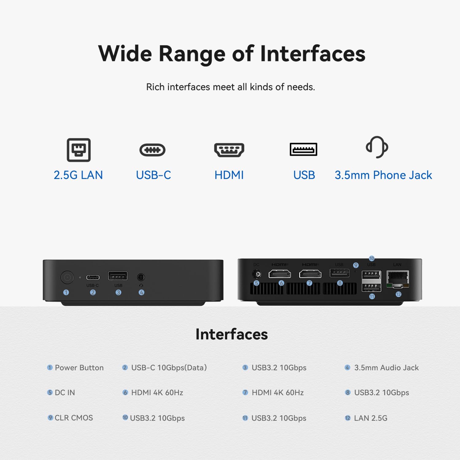 【Reliable Service +Rich interfaces】Interfaces: DC Jack*1,USB3.2 Gen2(10Gbps)*4,LAN 2.5Gbps*1 3.5mm Audio Jack*1,HDM(Max 4K 60Hz)*2,USB-C(Data 10Gbps)*1. More devices (office equipment, printers, etc.) can be connected, making it more convenient to use.If you have any questions about TRIGEKY mini PC, please don't hesitate to contact us. We offer lifetime technical support, 1-year worry-free warr--anty and 24-hour customer service.