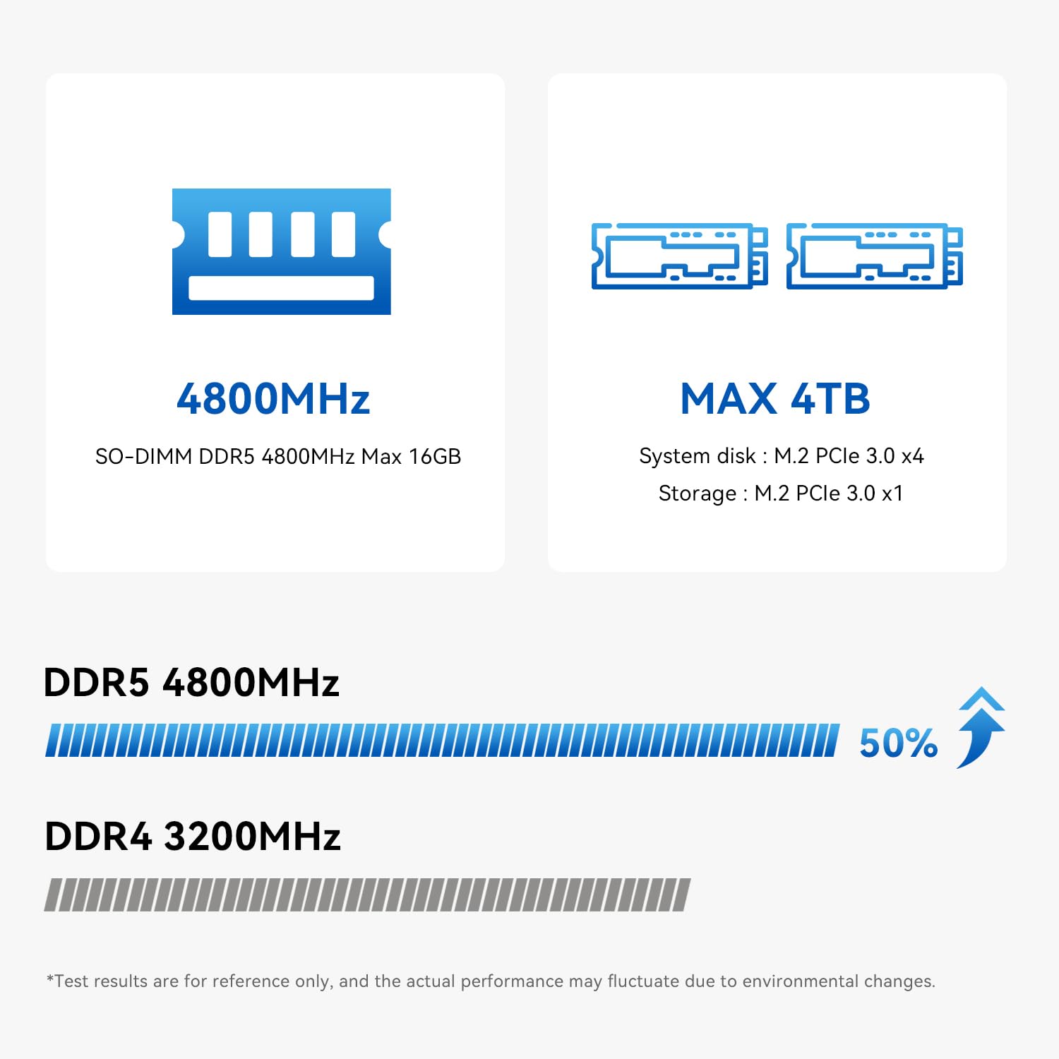 【16G DDR5 4800MHz + M.2 2280 500GB SSD】Trigkey Key mini N100 desktop computer is equipped with 16G DDR5 RAM and 500G SSD, which has faster reading speed and better performance compared with DDR4 3200MHz. DDR5 has significant improvements in all aspects, especially in bandwidth, speed and energy efficiency, allowing you to achieve faster work efficiency.