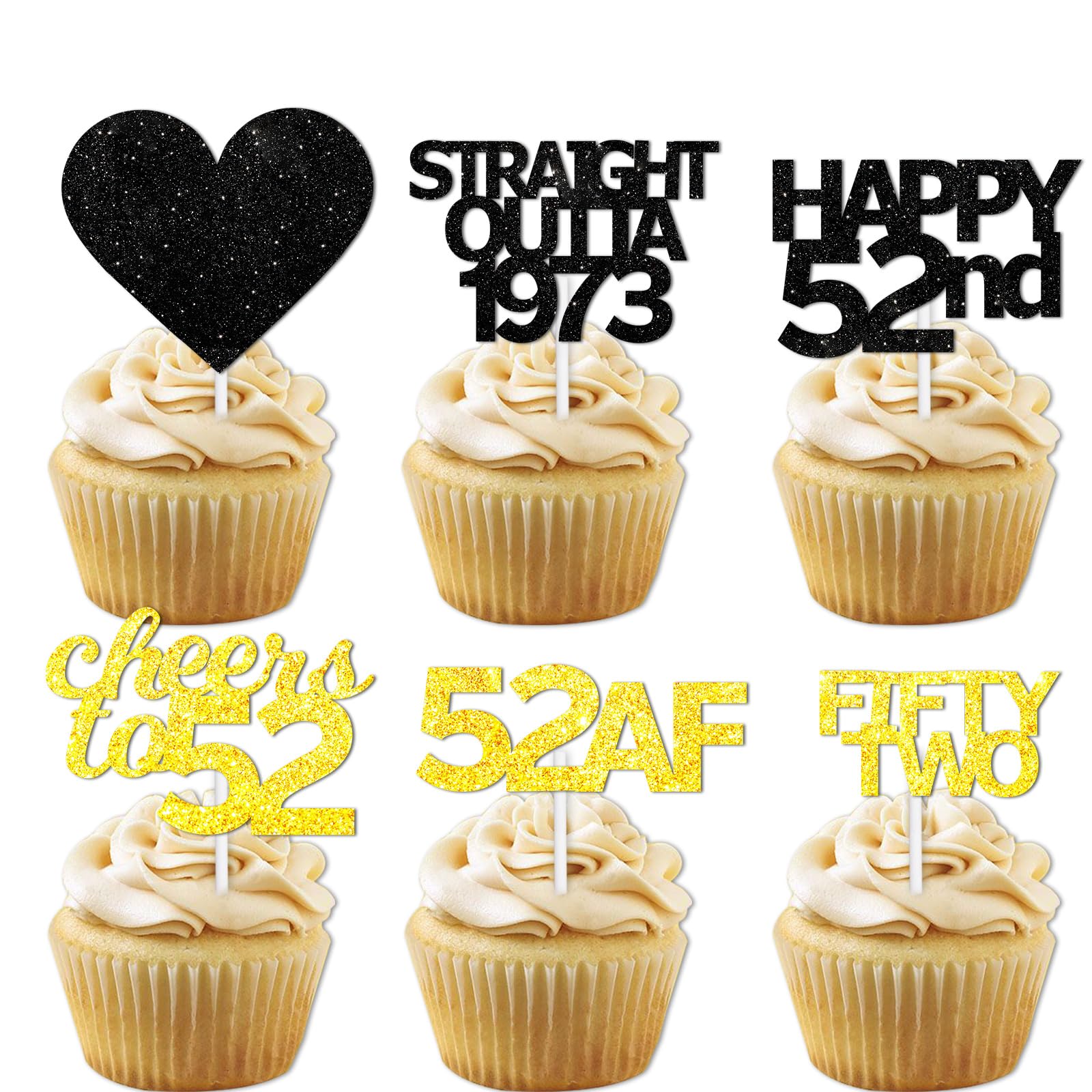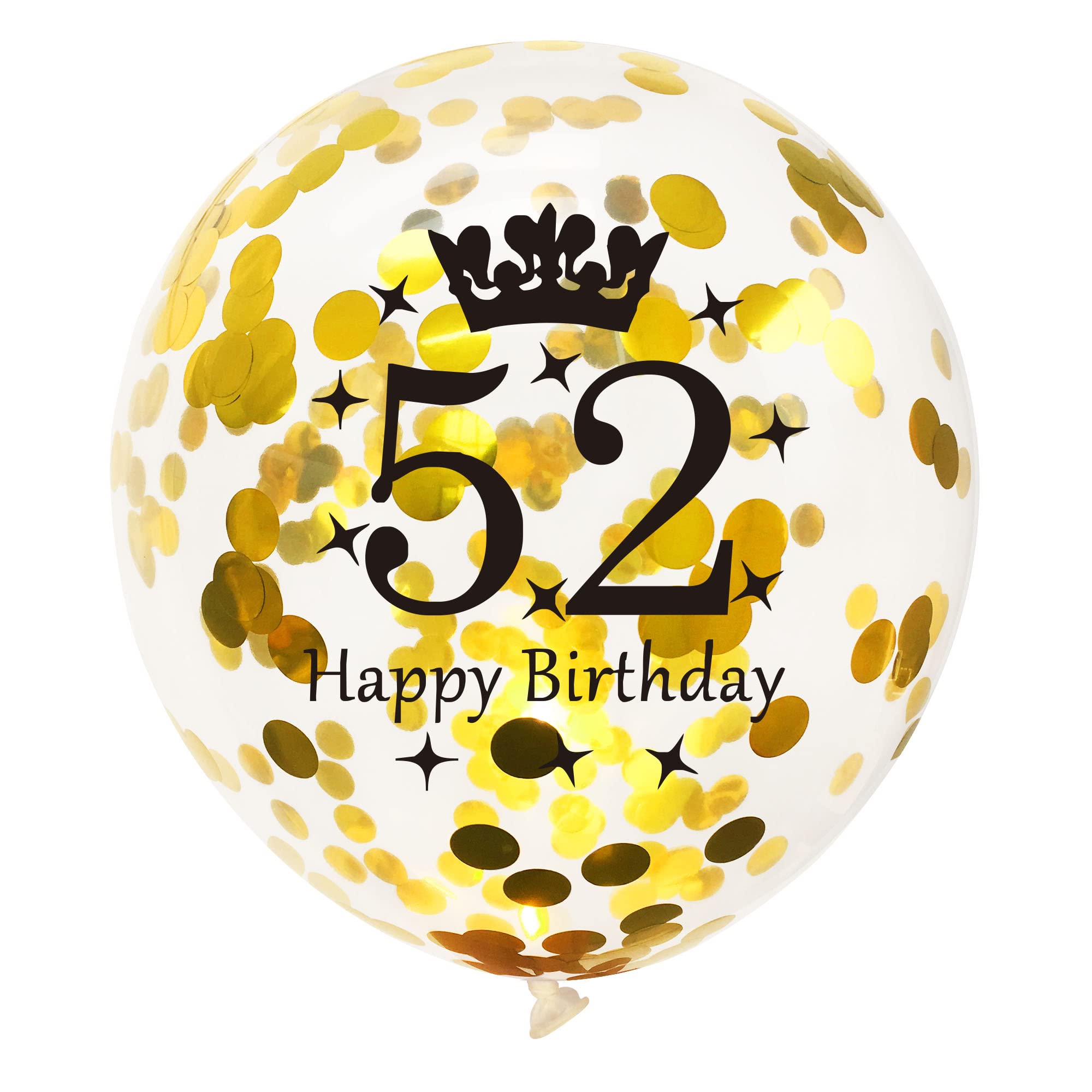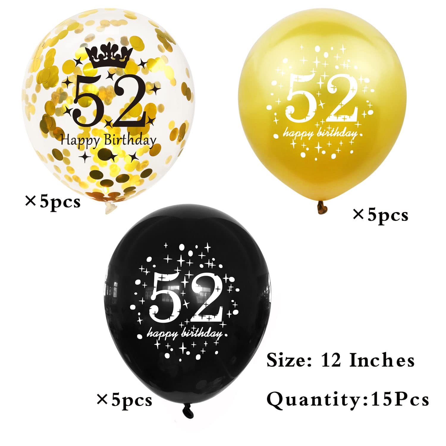 Package:5 pieces 12 inch black latex balloon printed with the words "52 Happy Birthday",5 pieces 12 inch gold latex balloon printed with the words"52 Happy Birthday",5 piece 12 inch gold confetti balloons printed with the words"52 Happy Birthday",very suitable for women men 52th birthday party decorations