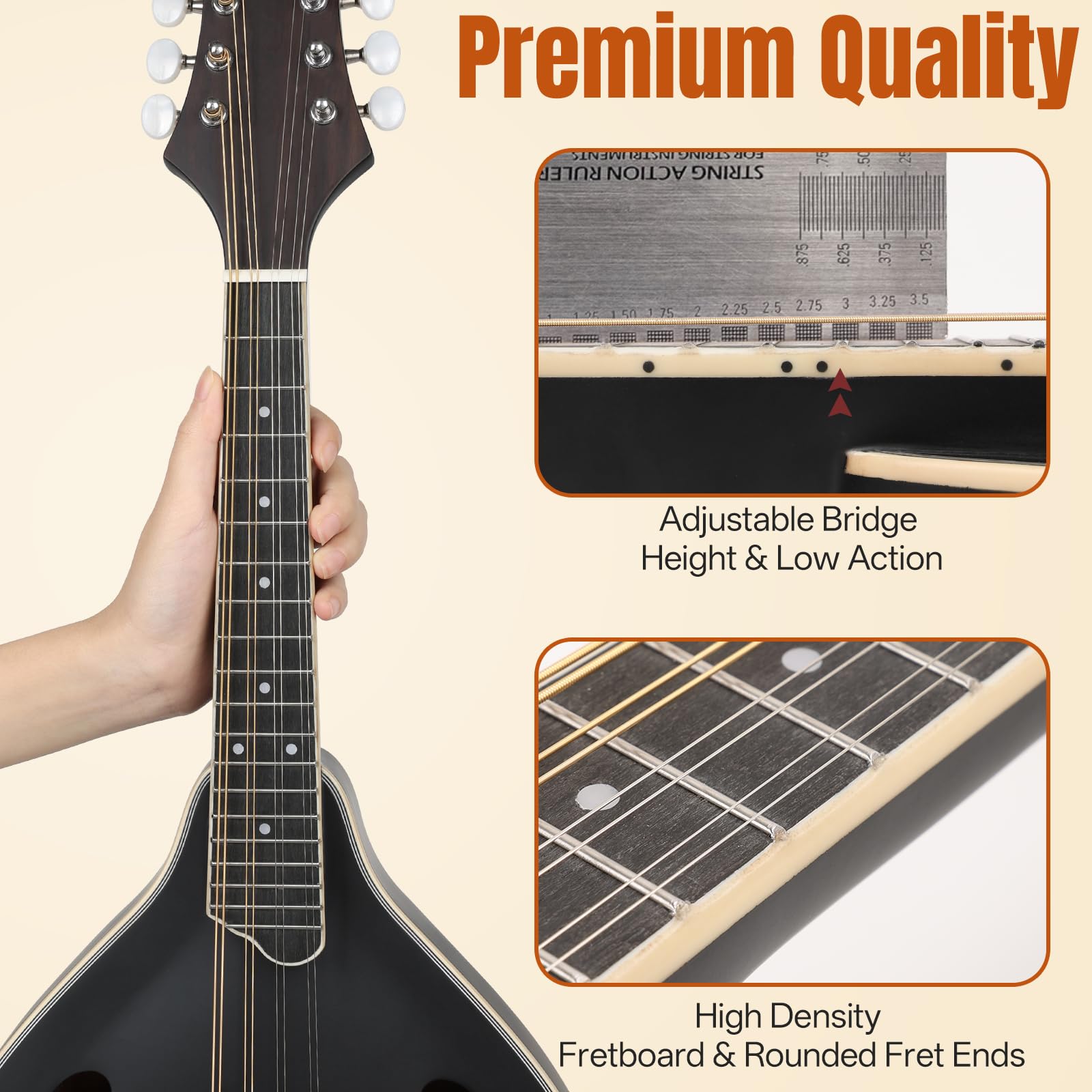 8 String Mandolin: Built with a sturdy, high-density fretboard and rounded fret ends for a smooth, comfortable playing experience and enhanced durability. Enjoy stable, accurate tuning with closed pegs and a high-quality 18:1 gear ratio, ensuring easy adjustments and reliable performance for both beginners and experienced players.