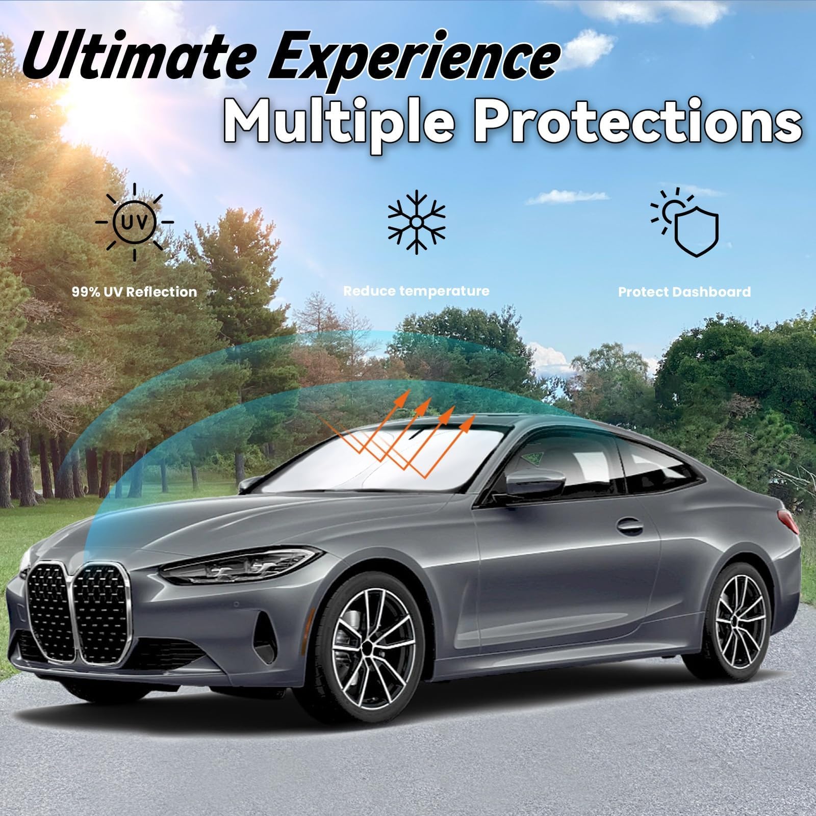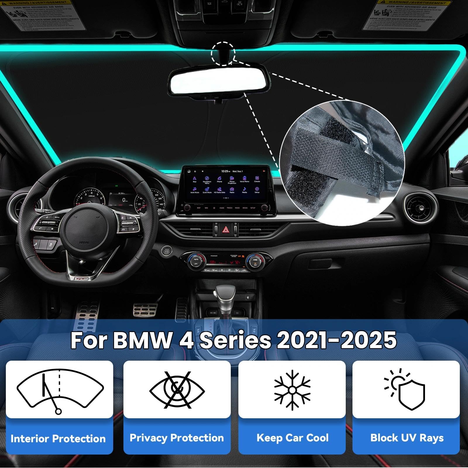 【Precise Fit】: Car sun shade for your BMW 4 Series 2021-2025 is custom-fit for a precise installation; It fits perfectly to your window without the need for suction cups; It won't sag or collapse, making it ideal for outdoor camping adventures