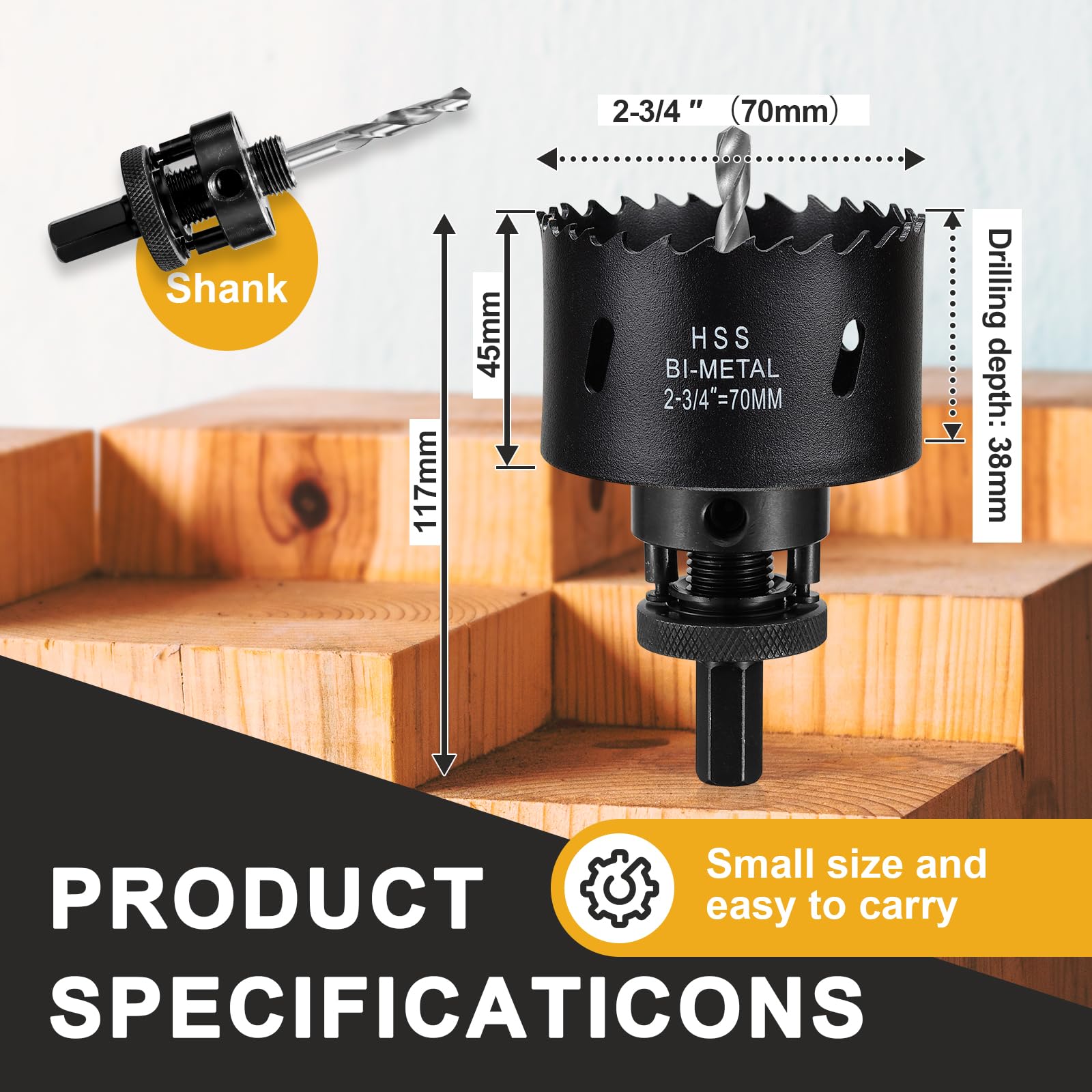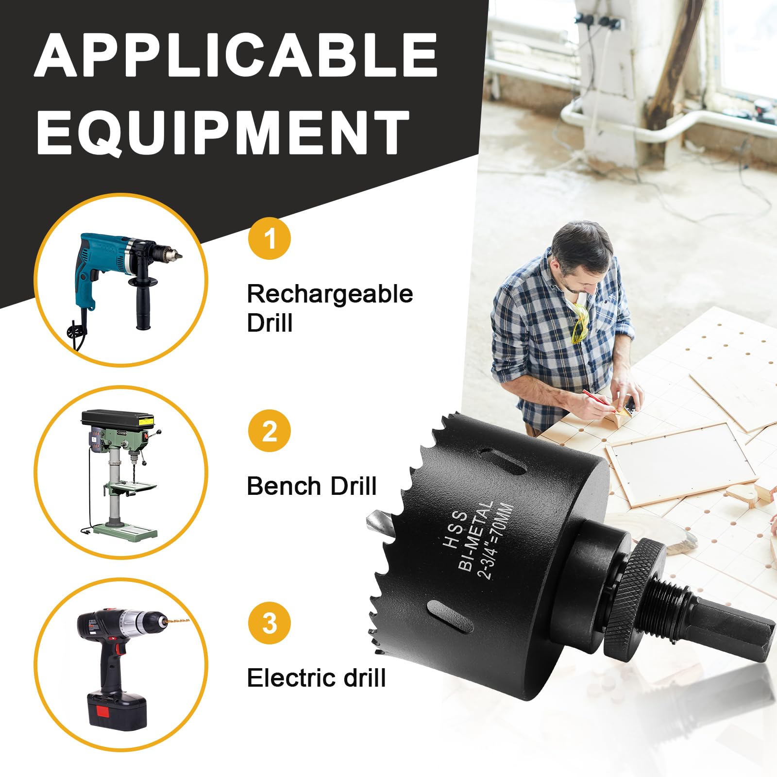 ITOOLFIRM HOLE SAWS for Wood, Metal, Ceiling Lights, Drywall, Sheet Iron and Steel Frame. Features: BI-Metal + High Speed Steel(HSS) Extremely fast sawing with minimal expenditure of force High concentric and side-stroke precision APPLIED TO CUT... Household wood Plywood Galvanized pipe Fire hose Gypsum board PVC boards Holes in Ceiling for lights Holes for vent or fans Holes in table or wall for cable COMPATIBLE DEVICEs Impact Driver Hand Drill Press Bench Drill Press Cordless Drill Precondition: drill chuck is required COMPATIBLE MATERIAL Wood Plastic Fiberglass Aluminum Copper INSTRUCTIONS Pre-drill using light contact pressure. Continue drilling with minimal, even pressure. Avoid oscillating while drilling. Allow hole saw to “air” when using with wood and wood alternatives. The saw comes to a complete stop on your material before pulling it away. DIFFERENCE: Due to manual measurement and production batch is not the same, the size, weight, color will get difference (within 1%) of the normal case. Miss Parts Problem: Each hole saw is coming with a drill bit and shank, if you have revceived a product from our store without the parts, please return or replace your order. HAVE ANY PROBLEM, PLEASE CONTACT US FIRST, YOU’LL NEVER REGRET MAILLING US!!!
