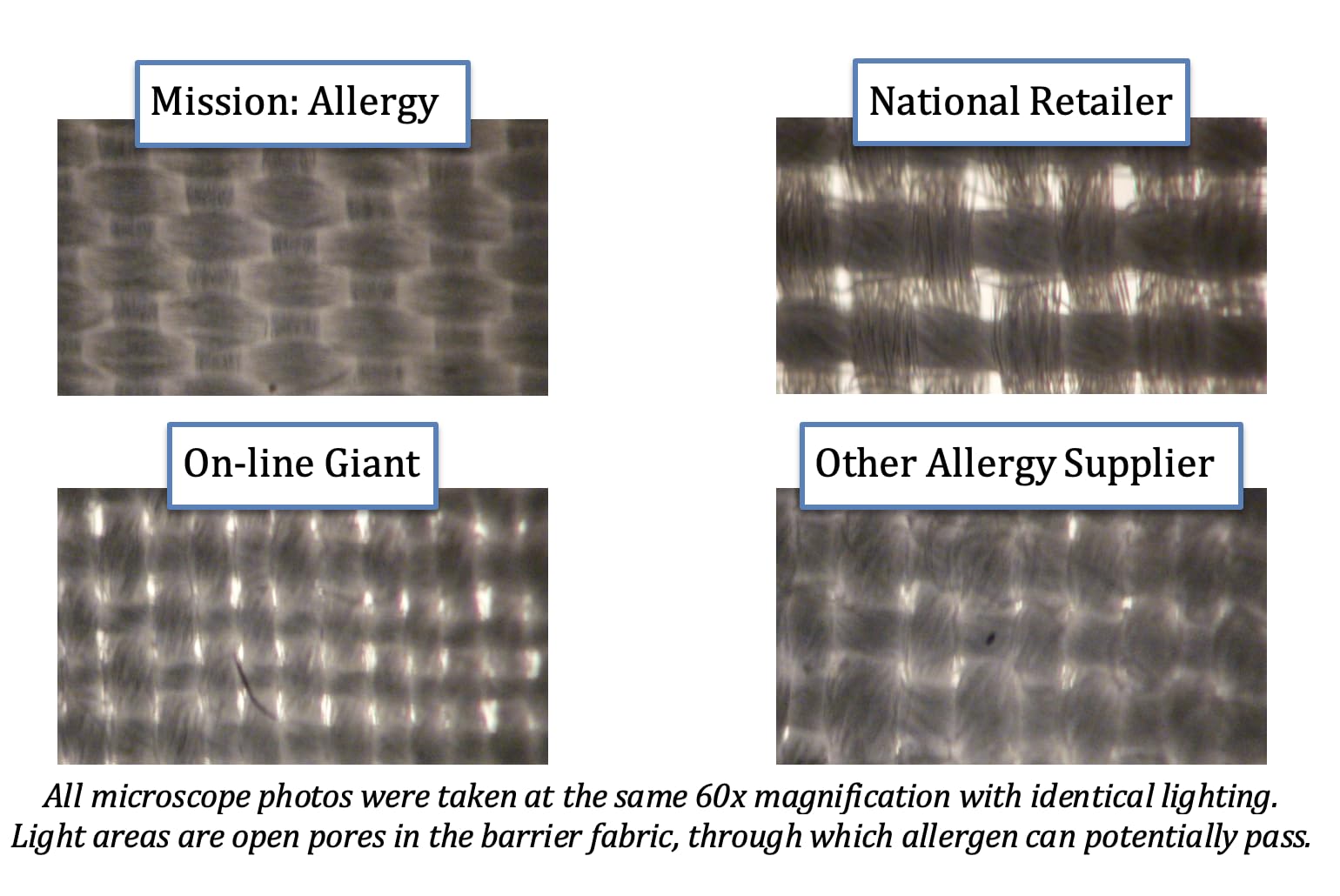 MISSION: ALLERGY Premium Microfiber Fabric is the ultimate allergen barrier: totally effective, silky soft, lightweight, and imperceptible beneath the pillowcase. It has a mean pore size of 2 microns to block all allergens, yet is air-permeable, making it completely comfortable to sleep on. It is not hot and sweaty, as are encasing fabrics made with membranes; does not allow any allergen escape, as do many cotton encasings; and does not accumulate surface allergen, as do encasings made with terry cloth or non-woven fabric. MISSION: ALLERGY Allergen Proof Pillow Encasings are manufactured with the highest quality sewing construction. The differences are immediately apparent. All seams and edges are bound with seam binding for durability. Zippers are of the highest quality, with an interior zipper flap to prevent allergen escape through the zipper webbing (no tape needed), and an exterior zipper flap for comfort. These medical grade encasings are suitable for adults or children with allergic asthma, allergic rhinitis, or allergic eczema (or simply for good hygiene). They are the ultimate allergen-proof pillow encasing for comfort, protection, and durability. 100% Woven Polyester Microfiber. Lifetime warranty. “… protect both your pillows and your mattress with special mite-proof covers, experts say. Be sure you get covers from a reputable company, like Mission Allergy…” THE NEW YORK TIMES: Much Ado About Dust Mites “Say sayonara to dust mites. The fix is to use hypoallergenic encasements on my mattress and pillows. Dr. Fost recommends Mission: Allergy.” HEALTH MAGAZINE: How healthy is your bedroom? “…The first step in your mite-control mission: the right pillow and mattress covers. Skip the cheapie versions—their weave isn't tight enough. Instead, invest in Mission: Allergy Premium Microfiber Allergen-Proof Encasings.” MENS HEALTH MAGAZINE: Clearing the Air on Allergies