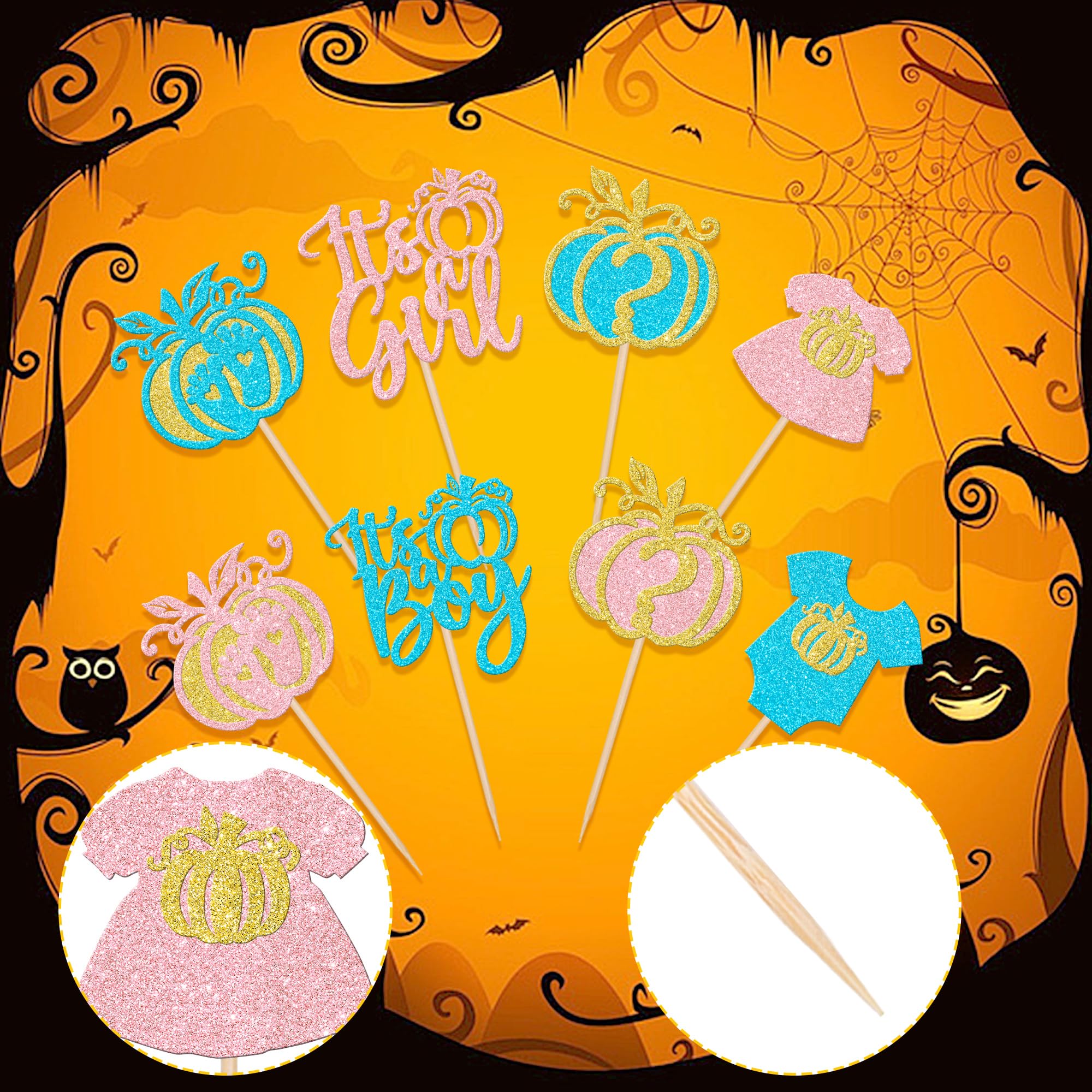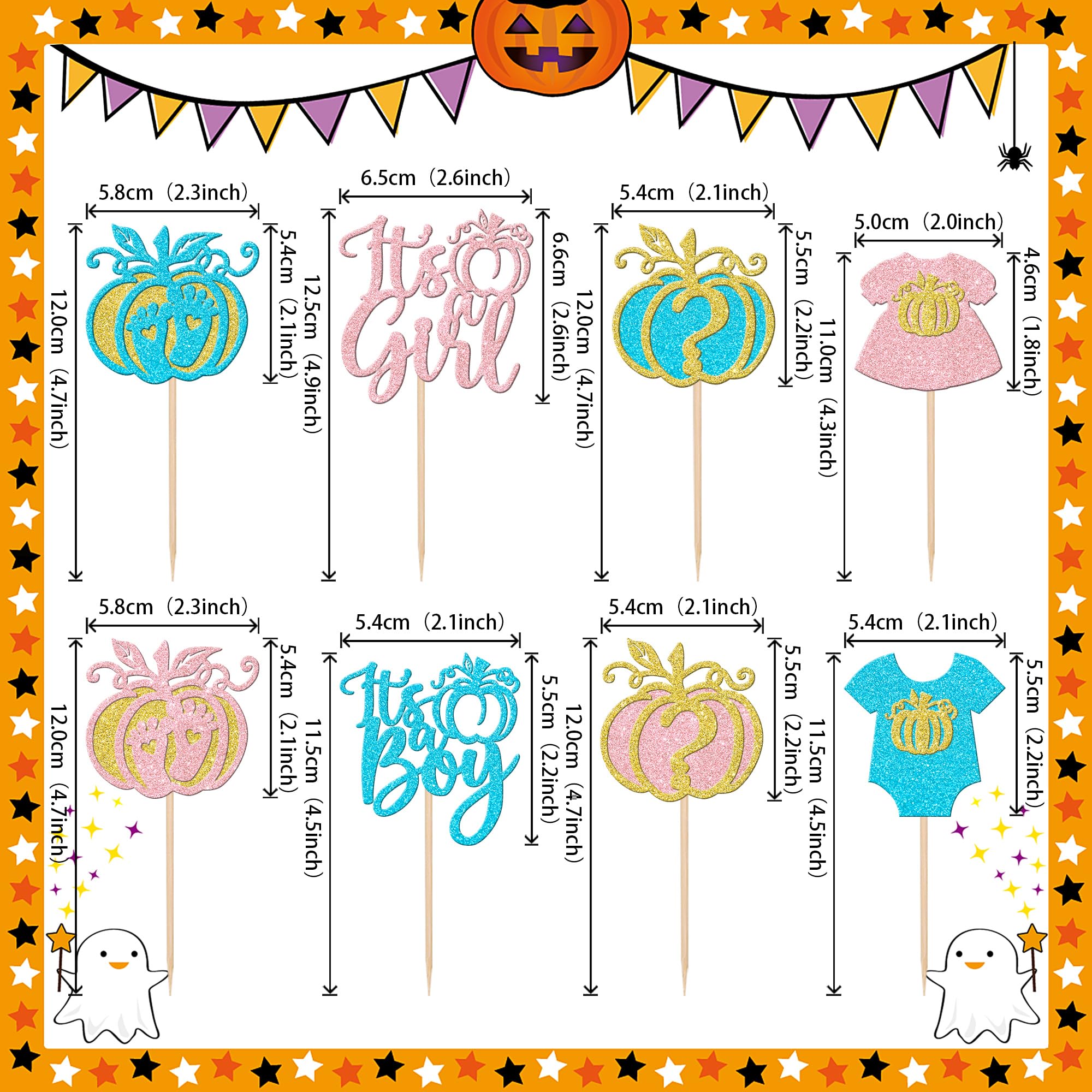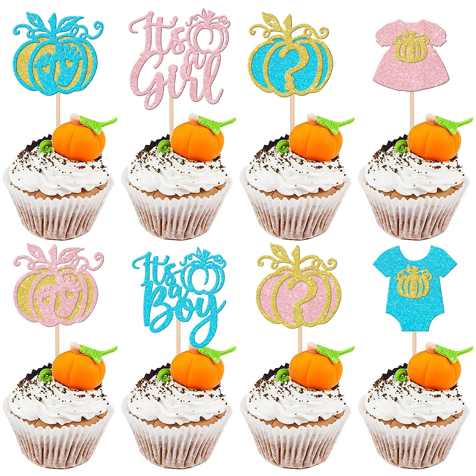 24 PCS Pumpkin Gender Reveal Cupcake Toppers Boy or Girl Cupcake Picks Pink or Blue Baby Feet Pumpkin Cupcake Decoration for Baby Shower Gender Reveal Kids Birthday party Cake Decorations Supplies Perfect for gender reveal theme party, baby feet onesie pumpkin theme party, boy or girl theme party , he or she theme party, pink or blue theme party, baby shower theme party, it's a boy it's a girl birthday theme party cupcake decorations supplies. Pack of 24 pcs, 3 pcs of each design. The size is 1.2 *5.1 inch ( with stick ) Made of high quality paper card stock and food grade sticks,thick and sturdy. These cupcake toppers are single glitter, the back is white, and they are intended for decoration only, please do not put them in oven or microwave. If the item you received has any defects, please contact us for refund.we will deal with it within 24 hours.