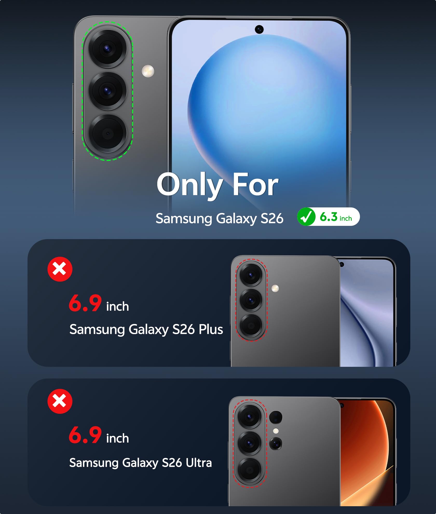 Compatibility: ONLY Fit Samsung Galaxy S26. Not for S26 Ultra/S26+/S26 FE, or any other phone models. Please confirm your model before purchase. NOTE: Before putting on our phone case (with built-in screen protector), remove the tempered glass screen protector from your phone first.