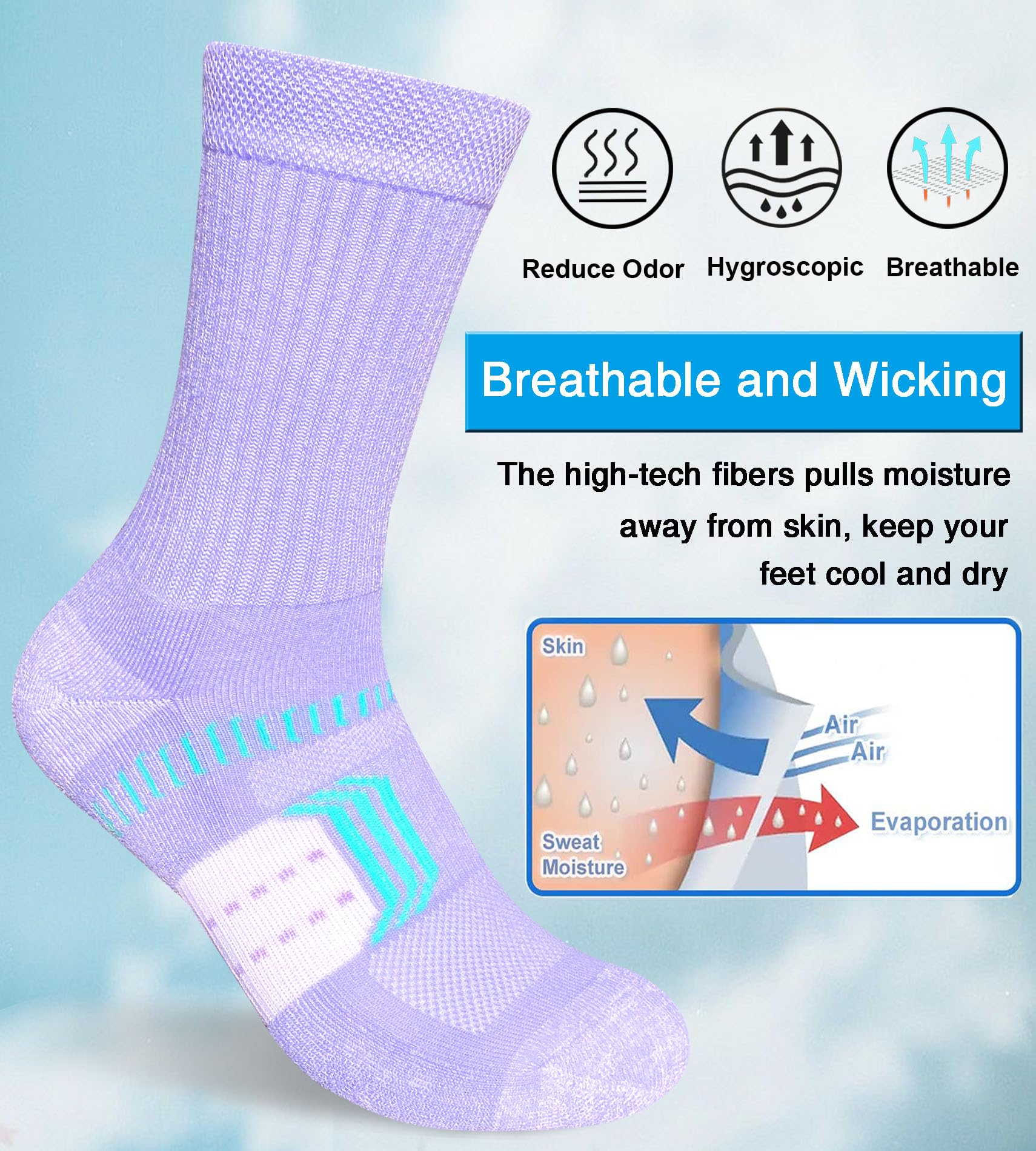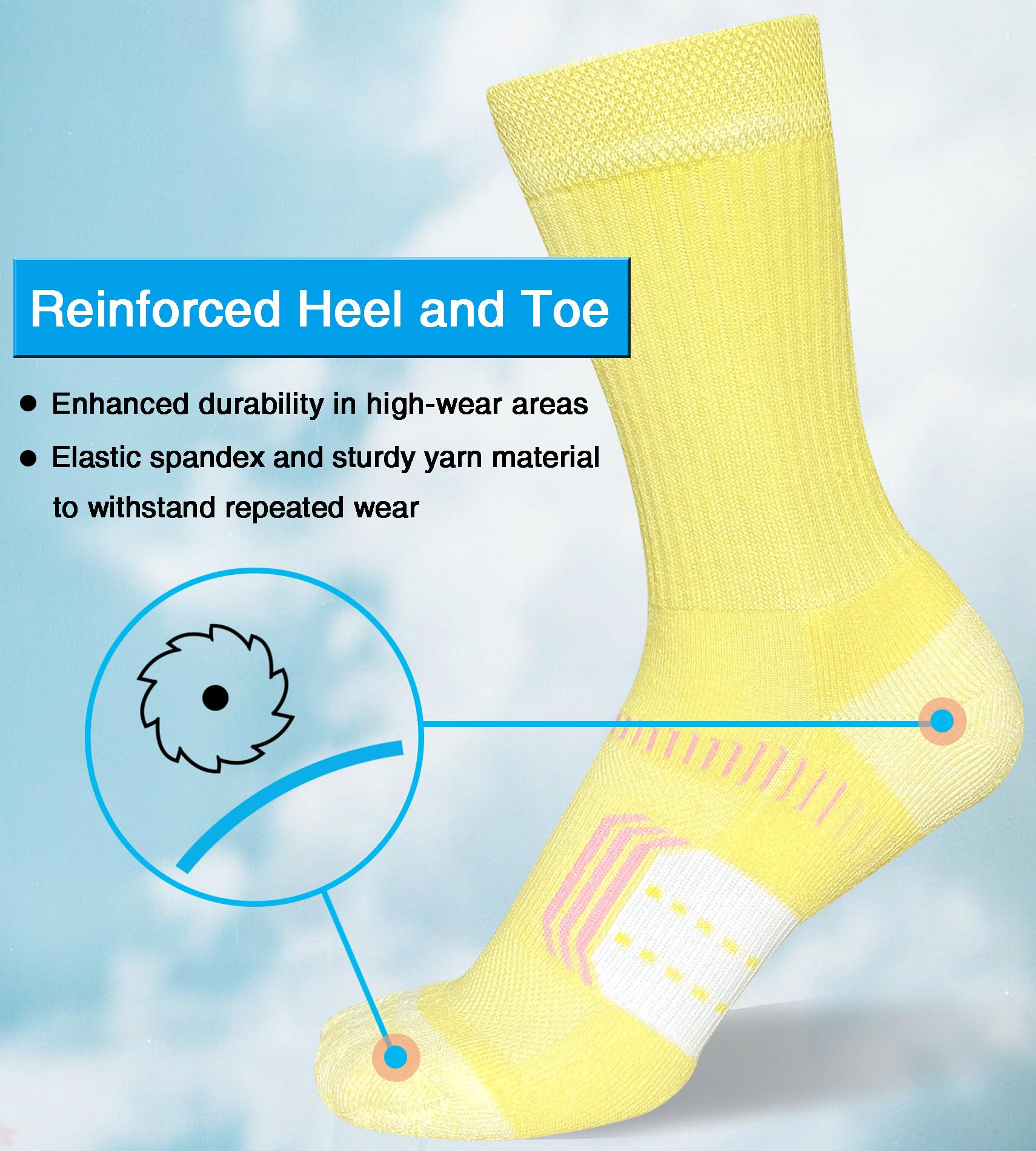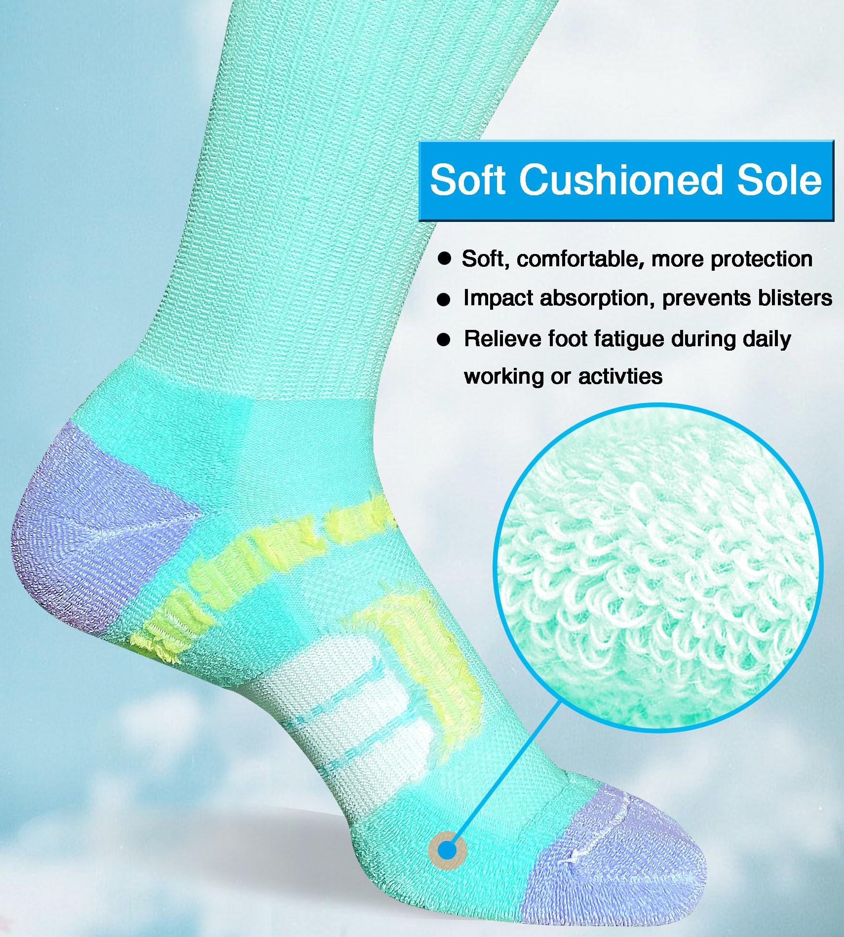 Comfortable Cushioned Athletic Socks: These womens socks with great soft cushion at the bottom, heel and toe areas, provide anti-blister protection, absorb shock and relieve foot pain when training, walking, running, hiking, camping etc