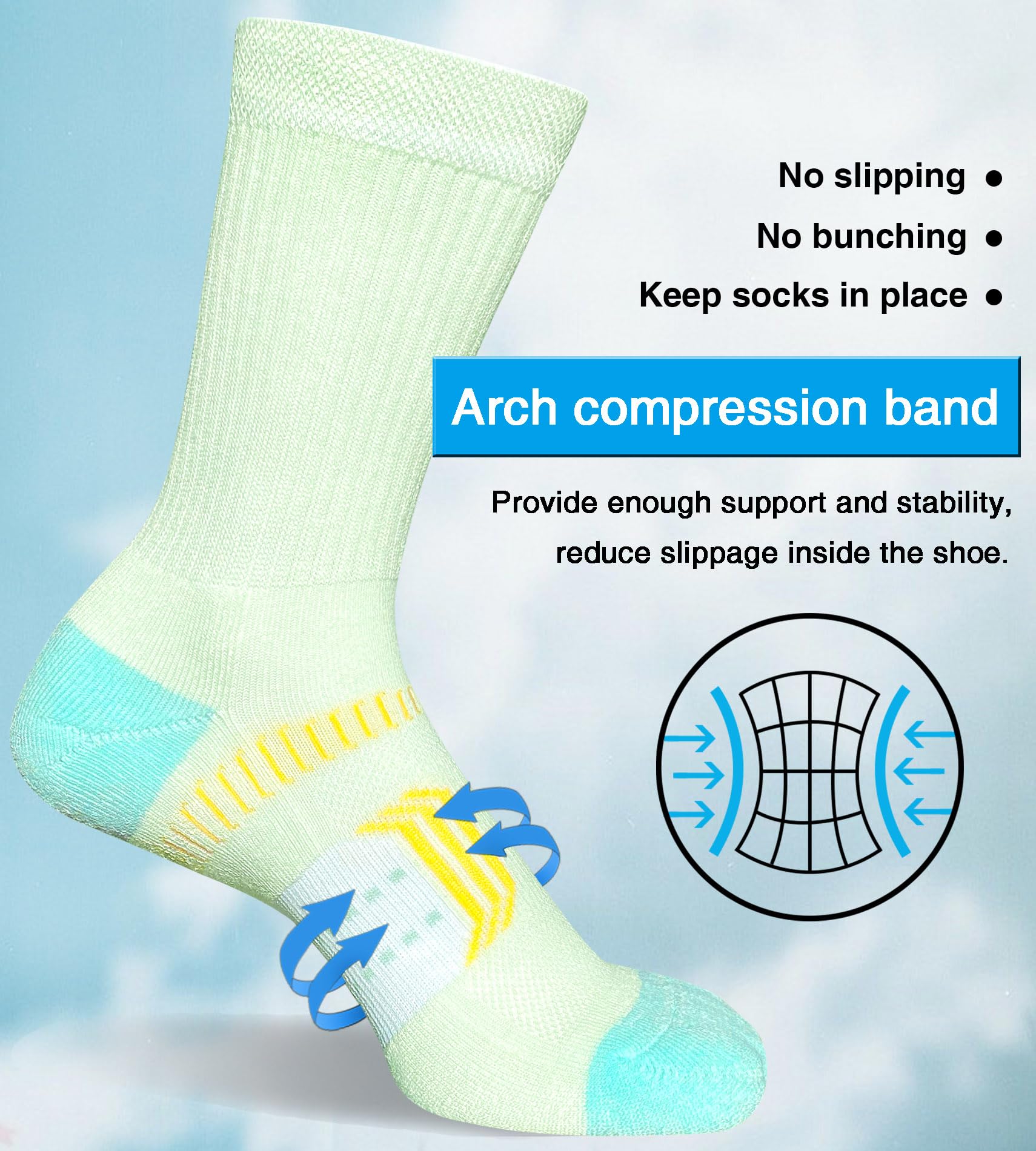 Non Slipp Running Socks: Elastic compression bands, used in areas of calf and feet arch, can ensure these crew socks fit tightly and comfortably against your calves and feet. Prevent the sock from slipping off