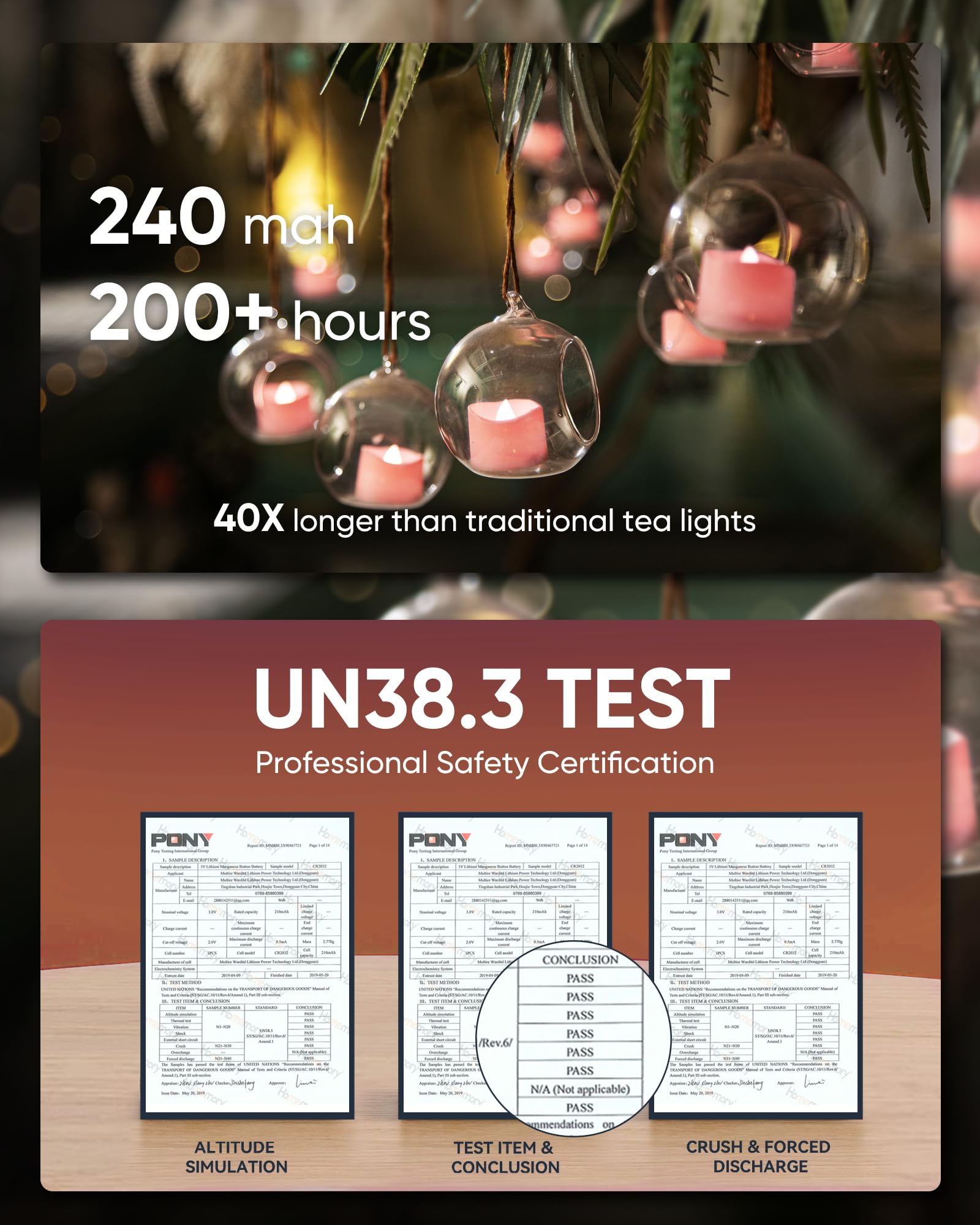 RELIABLE & SECURE: Homemory LED tea lights are tested rigorously, ensuring their reliability. With (UN38.8) internationally certified batteries and healthy polypropylene materials, plus a secure battery cap design, we care about your safety